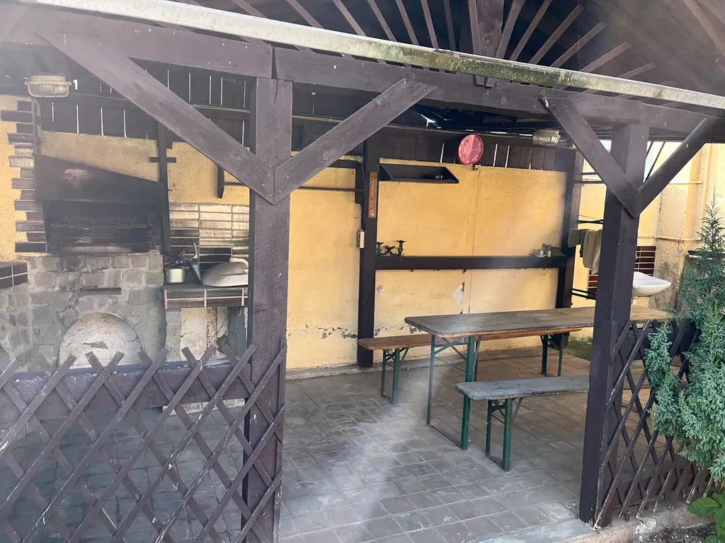 Ve dvoře zahrady se dále v levé části přístavby nacházejí prostorná garáž 20 m2, dále nebytové prostory dřevníku, dílny, chlévů o výměře cca 100 m2. Za průjezdem v pravé části dvora je umístěna krytá pergola s venkovním krbem a posezením. Dále se nachází na zahradě skleník pro pěstování zeleniny. Na travnaté zahradě na jihovýchodní slunné straně je několik ovocných stromů.