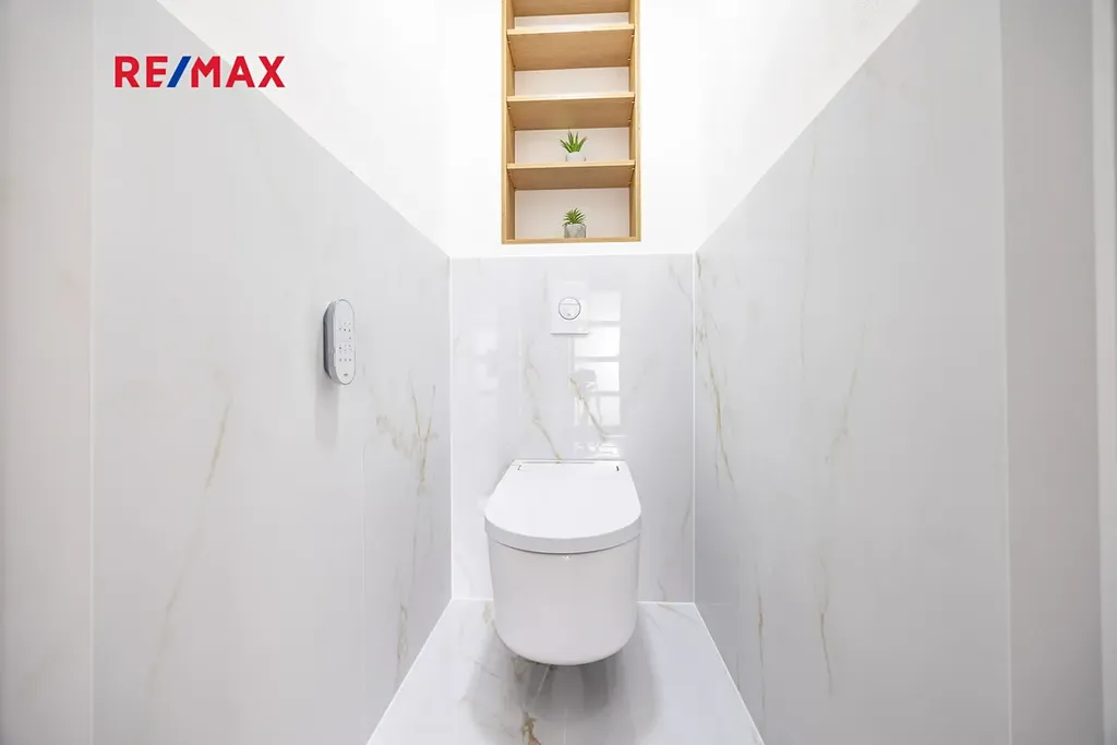 - Samostatná toaleta je výjimečná svým provedením – osazen je luxusní automatický záchod Grohe, který je nadstandardním doplňkem tohoto krásného bytu.
