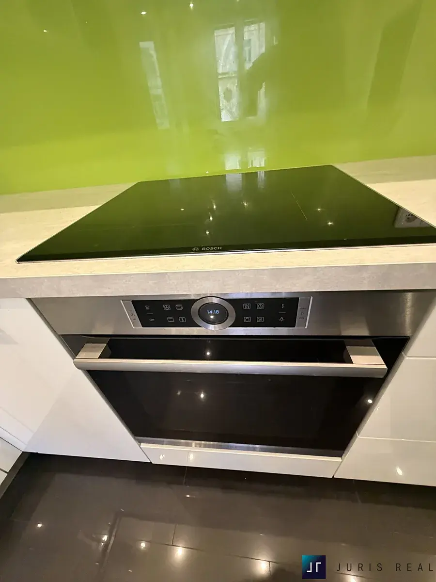 Dominantou bytu je světlý obývací prostor s moderní kuchyňskou linkou v bílém vysokém lesku, vybavenou vestavnými spotřebiči Bosch a designovým skleněným obkladem v zeleném tónu. Jednotná dřevěná podlaha v obytné části podtrhuje elegantní charakter interiéru, který působí vzdušně, čistě a nadčasově. Prostor nabízí dostatek místa pro velkou sedací soupravu i reprezentativní jídelní část.