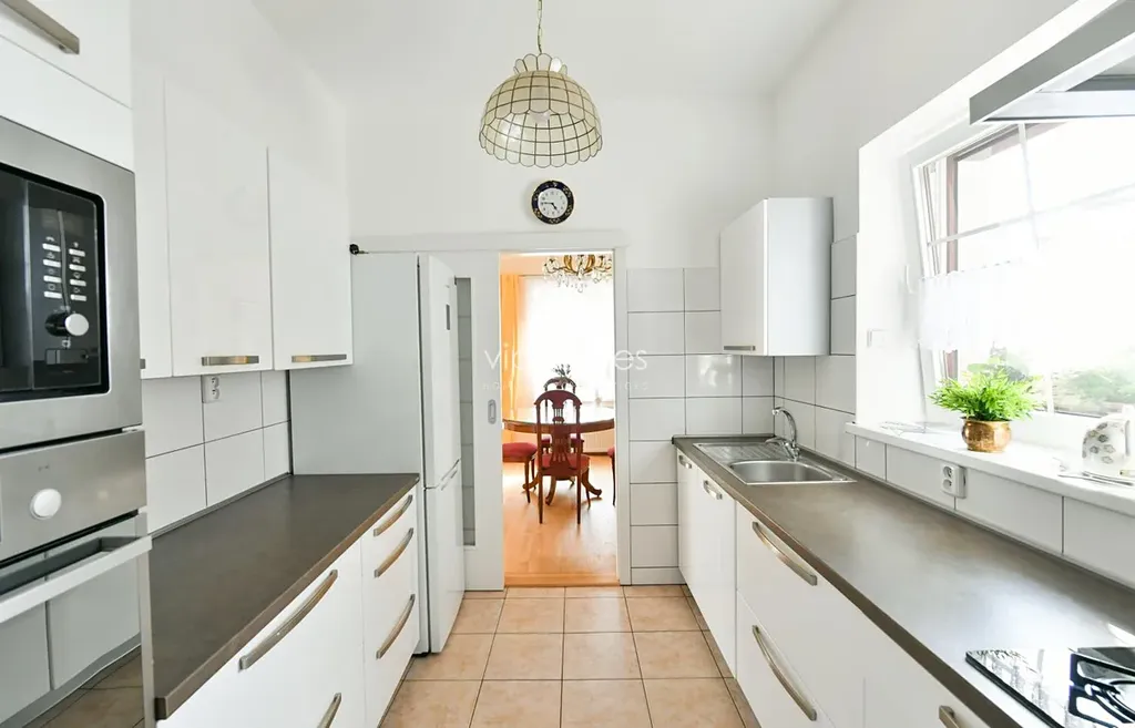 Stylově zařízený dům nabízí 6 ložnic a 2 koupelny. Vnitřní dispozici tvoří formální vstupní hala, obývací pokoj s krbem, plně vybavena kuchyň s jídelním koutem a vstupem na terasu s bazénem, dvě ložnice, koupelna (vana, toaleta, bidet, masážní sprcha), prádelna a samostatná toaleta. V patře je společenský pokoj / herna pro děti, dvě ložnice, pracovní kout, koupelna (sprchový kout a toaleta) a dva balkóny. Prostorný suterén s dostatkem úložných prostor, sociální zařízení ( toaleta / sprcha ). Největším benefitem domu je půvabná zahrada, která obklopuje dům. Relaxační zóna s bazénem a terasou pro posezení s rodinou a přáteli. Garáž pro dva vozy.
