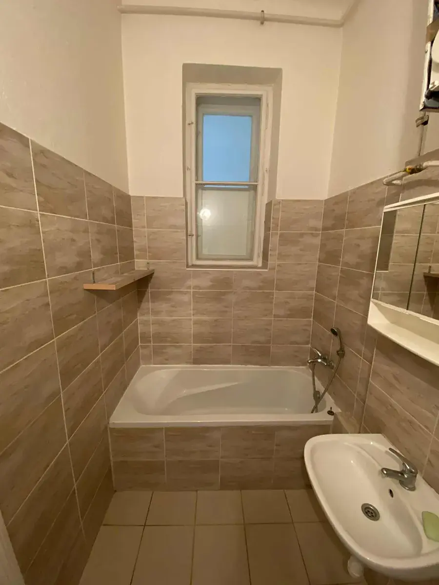 Kuchyně má prostor pro velký jídelní stůl a okno s mléčným sklem orientované do domovní chodby (okno je neprůhledné, ale světlo dává). Koupelna je také s oknem, vysoké okno s mléčným sklem do chodby, koupelna má místo pro pračku i sušičku. Byt má samostatné wc.