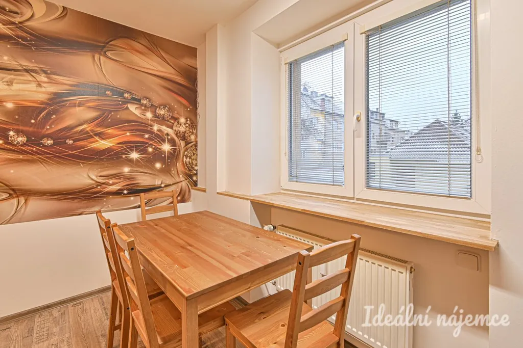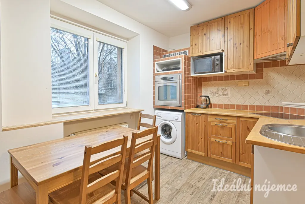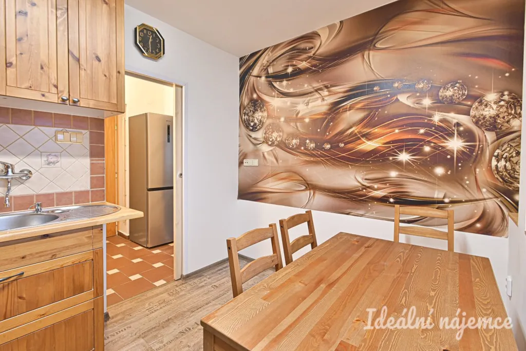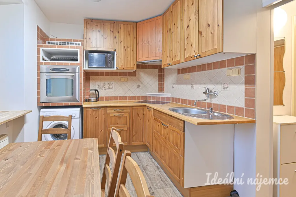 Byt se nabízí vybavený dle fotografií. Dispozičně je byt řešen prakticky – samostatná kuchyně s jídelním koutem, oddělený obytný pokoj, koupelna se sprchovým koutem a toaletou a vstupní chodba. Kuchyňská linka je vybavena spotřebiči, k dispozici je také jídelní stůl se židlemi.