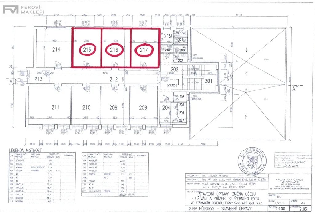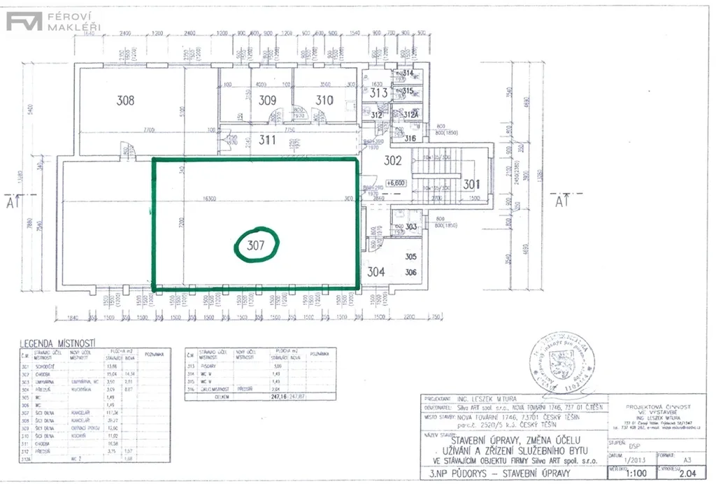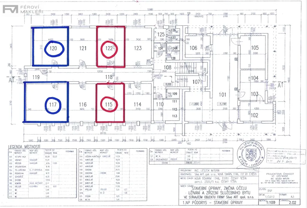 Nabízíme pronájem nebytových prostor na zajímavé adrese za rozumnou cenu. Komerční prostory se nacházejí v oploceném areálu v Českém Těšíně na ulici Nova Tovární. Jedná se o bezpečnou lokalitu s dostatkem parkovacích míst v areálu i mimo areál v těsné blízkosti pronajatých místností. Prostor v budově lze využít jako kanceláře, sklad, dílnu, ateliér nebo provozovnu. Jedná se o 4 místnosti v přízemí, 3 místnosti v prvním patře a 1 velká místnost ve druhém patře. Velikost místností je označena barevně na půdorysu, Červeně do 18 m2 - místnosti č. 115, 122, 215, 216, 217. Modře do 26 m2 místnosti č. 117 a č. 120. Zeleně 76 m2 místnost č. 307. Cena pronájmu včetně vytápění a internetového připojení a používání společné kuchyňky na chodbě a oddělených WC pro muže a ženy je za místnosti 18 m2 3500,- Kč/měsíc, za místnosti do 26 m2 4500,- Kč/měsíc a za největší místnost o velikosti 76,7 m2 je 12000,- Kč/měsíc. Spotřebu elektřiny, vody a tepla si platí nájemce dle vyúčtování skutečné spotřeby. Ke každému pronájmu je povinná měsíční platba za úklid v budově (mytí chodby, schodů, oken, dveří, kuchyňky, wc), údržba zeleně a odklízení sněhu 1000,- Kč. Pokud si nájemce pronajme více kanceláří, bude poskytnuta sleva. Provize RK v ceně jednoho nájmu platí nájemce. V areálu není kantýna, ale je možnost objednat si dovážku jídla dle denní nabídky.
