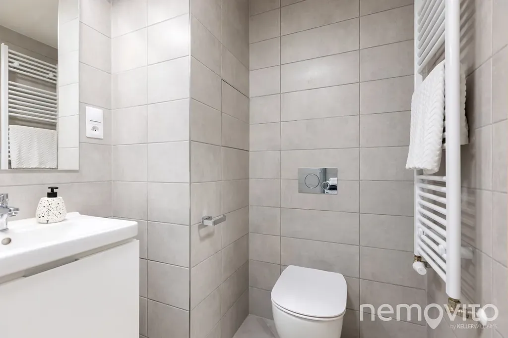 Koupelna je vybavena vanou a WC, k dispozici je taktéž místo na pračku nebo sušičku. Byt je umístěn v pátém podlaží (čtvrté patro) nově dokončené budovy s bezbariérovým vstupem. Hostivařský lesopark je doslova přes ulici, Milíčovský les pak zhruba 450 m. Metro je necelý kilometr či 2 min BUSem. Pokud vás o bytu zajímá více informací, rád vám pošlu odkaz na web s větším množstvím fotek, plánkem a dalšími informacemi.