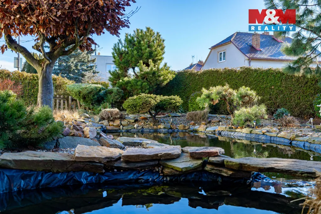 Zahrada je chytře rozdělena na dvě části. Užitková zóna slouží k pěstování, zatímco relaxační část je skutečnou oázou klidu. Najdete zde kryté posezení a přírodní jezírko s kořenovou čističkou vody, které v kombinaci s přírodními doplňky vytváří harmonický celek splývající s okolím.