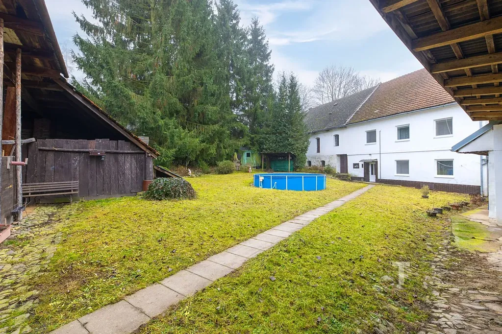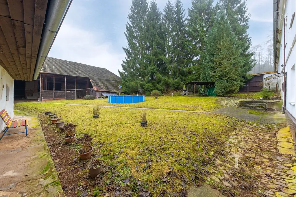 Má tvar písmene “U”, kde zbylou část tvoří kamenná zeď a vzrostlé smrky. Je tu mnoho místa na skladování, podnikání, chování hospodářských zvířat, které mohou využít větší pozemek k výběhu či pastvě.