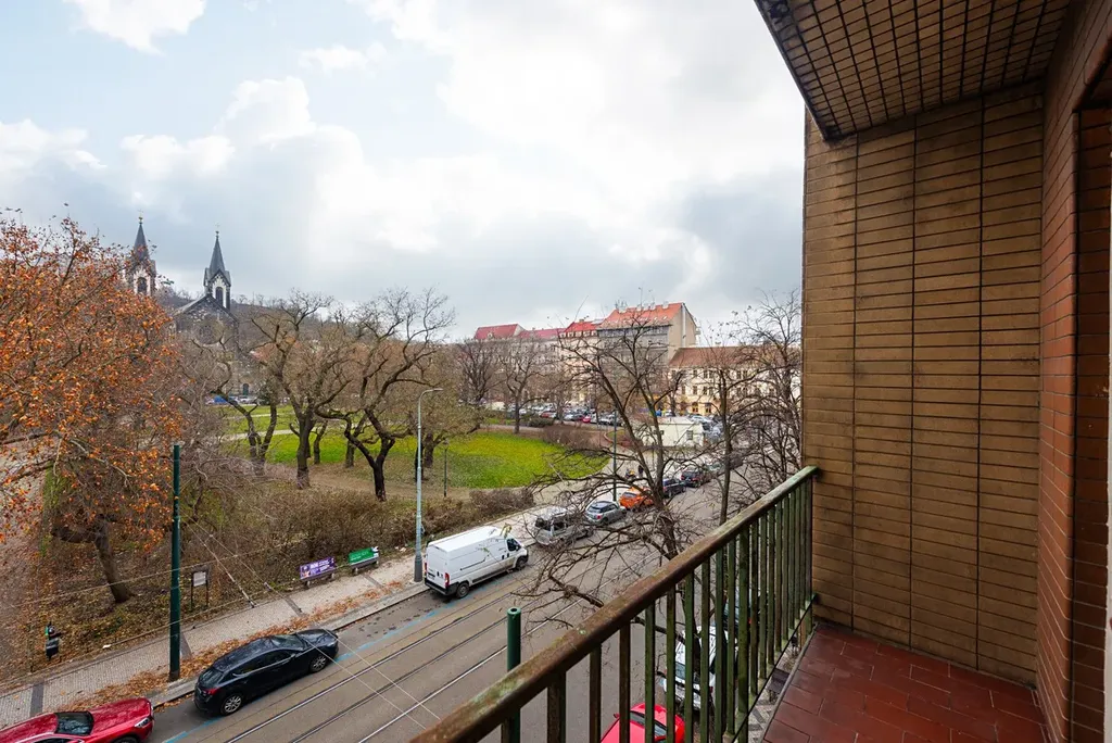Byt disponuje dvěma balkony – jeden je přístupný z kuchyně a orientovaný do klidného vnitrobloku na severní stranu, druhý navazuje na jeden z hlavních pokojů orientovaných na jižní stranu. Odtud se otevírá krásný výhled na Karlínské náměstí, kostel sv. Cyrila a Metoděje a panorama Vítkova.