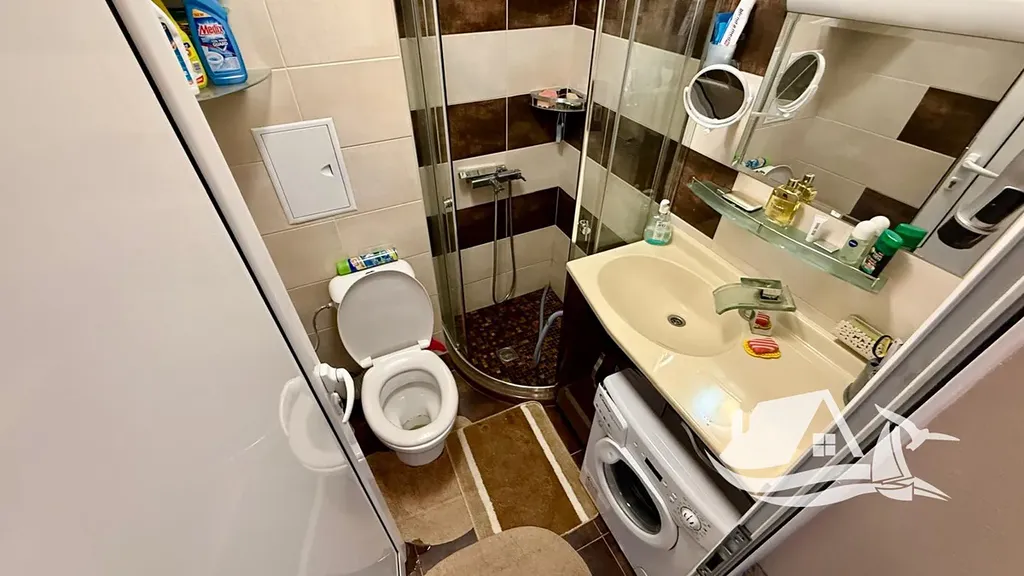 Dispozice zahrnuje vstupní chodbu, obytný prostor s kuchyňským koutem, koupelnu se sprchovým koutem a balkon, odkud se otevírá výhled na moře. Právě balkon je místem, kde se den zpomaluje - ideální na ranní kávu i večerní posezení při západu slunce. Studio se prodává plně zařízené a vybavené, připravené k okamžitému užívání bez dalších investic.