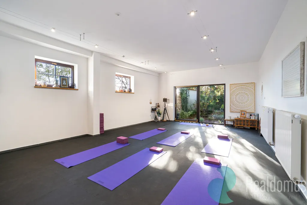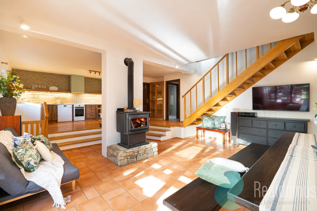 V přízemí se nachází velká obytná část – prostorná kuchyně propojená se společenskou místností s krbovými kamny a jídelnou, odkud je přímý vstup na krytou terasu a zahradu. Součástí přízemí je také velká víceúčelová místnost (cca 50 m²), kterou lze využít jako hernu, tělocvičnu, společenský prostor nebo třeba domácí kino. Nechybí sprchy, toalety, technické zázemí a sklad. V horním patře je klidová část domu s pěti samostatnými pokoji, koupelnou s vanou a samostatným WC.