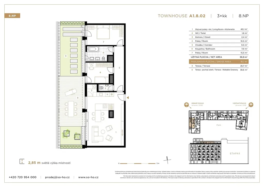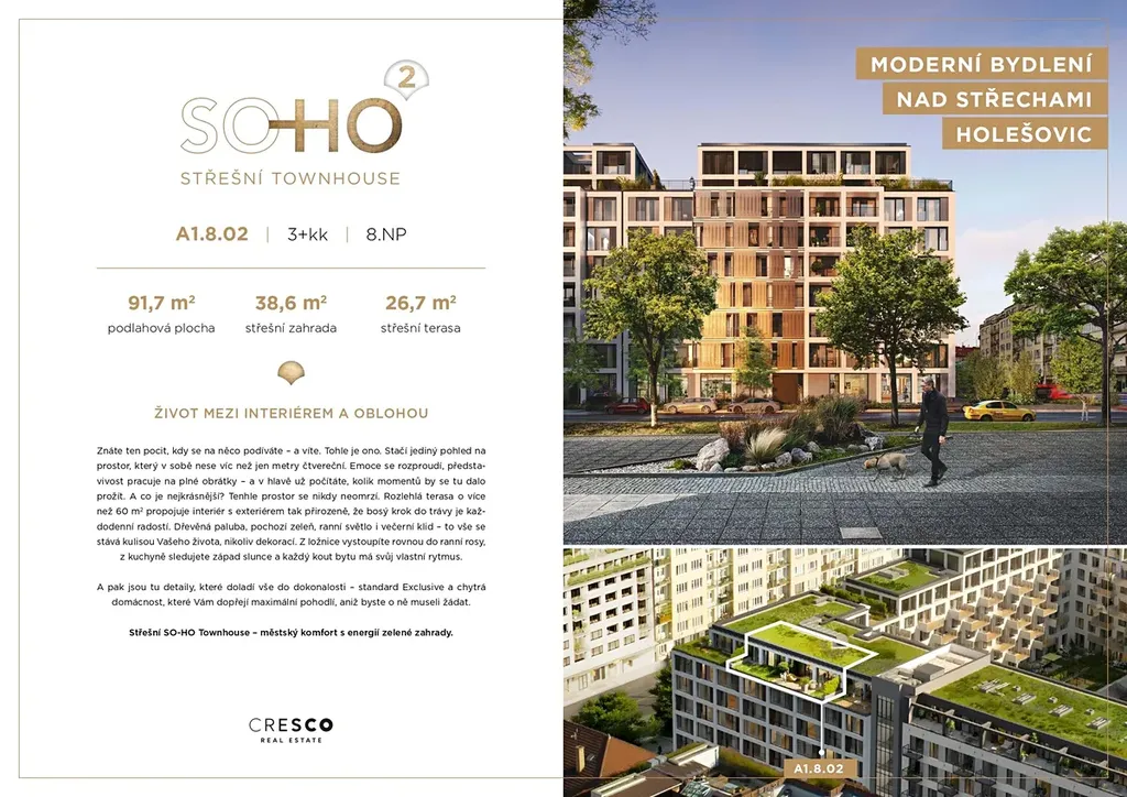 Atraktivní byt s klimatizací o dispozici 3+kk (91,7 m²) s nadstandardní terasou (65,3 m²) orientovaný na západ se nachází v 8. nadzemním podlaží moderní novostavby 2. etapy projektu SO-HO Rezidence v jižní části Holešovic. Tento prostorově efektivně řešený byt nabízí světlý, otevřený obývací prostor s kuchyní a jídelnou, plynule navazující na terasu s vlastní zahradou, ideální pro relax i společenská setkávání. Součástí bytu je hlavní ložnice s dostatkem úložných prostor a druhý pokoj vhodný jako dětský pokoj, pracovna či pokoj pro hosty.