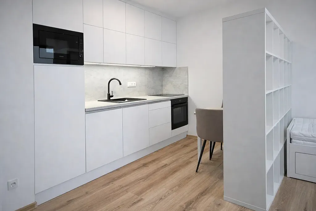 - moderní kuchyňská linka včetně spotřebičů (varná deska, trouba, digestoř, mikrovlnná trouba, lednice, myčka),