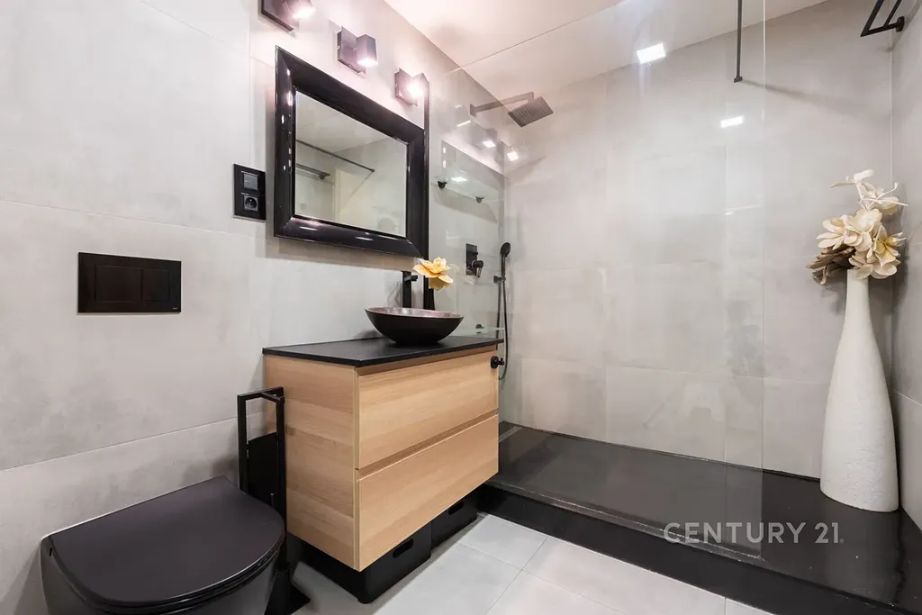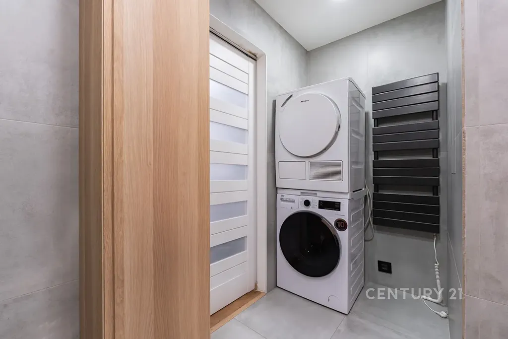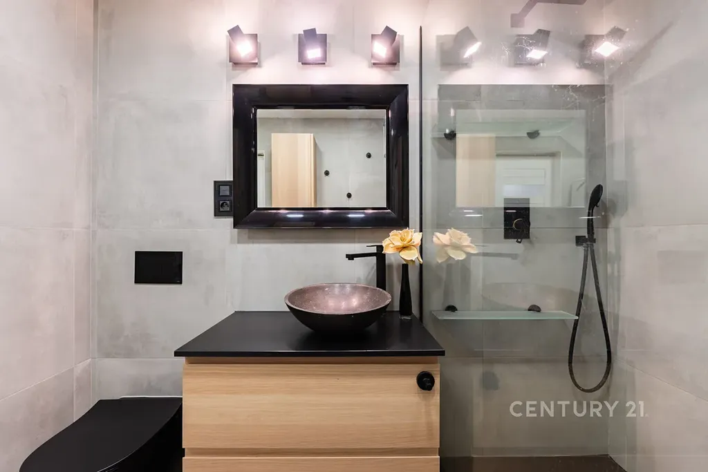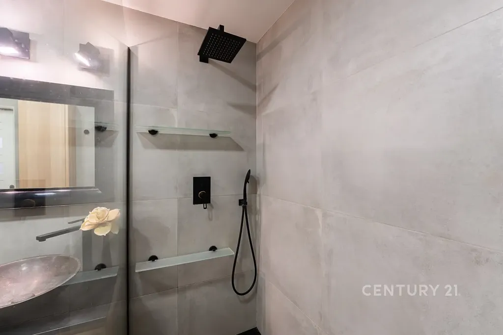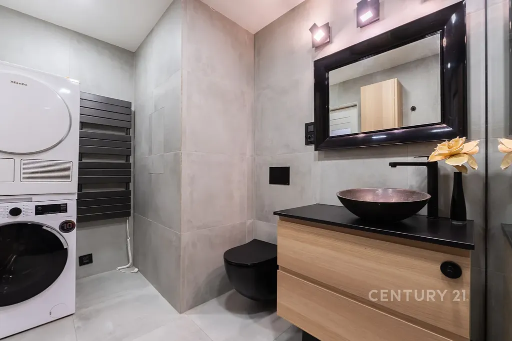 • Stylová koupelna se sprchovým koutem, velkoformátovými obklady, pračkou, sušičkou, skříňkou pod umyvadlo, zrcadlem a WC