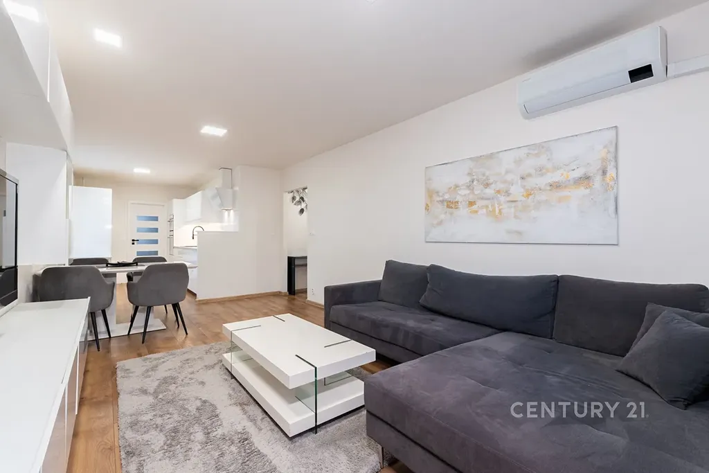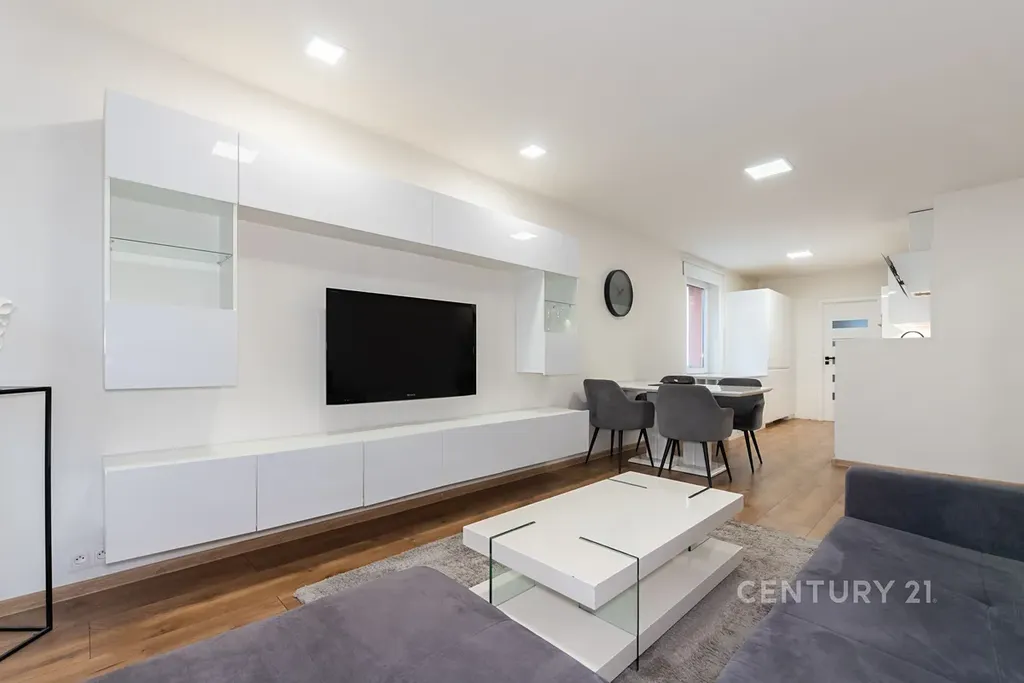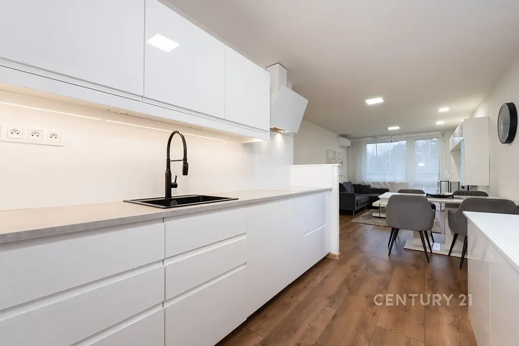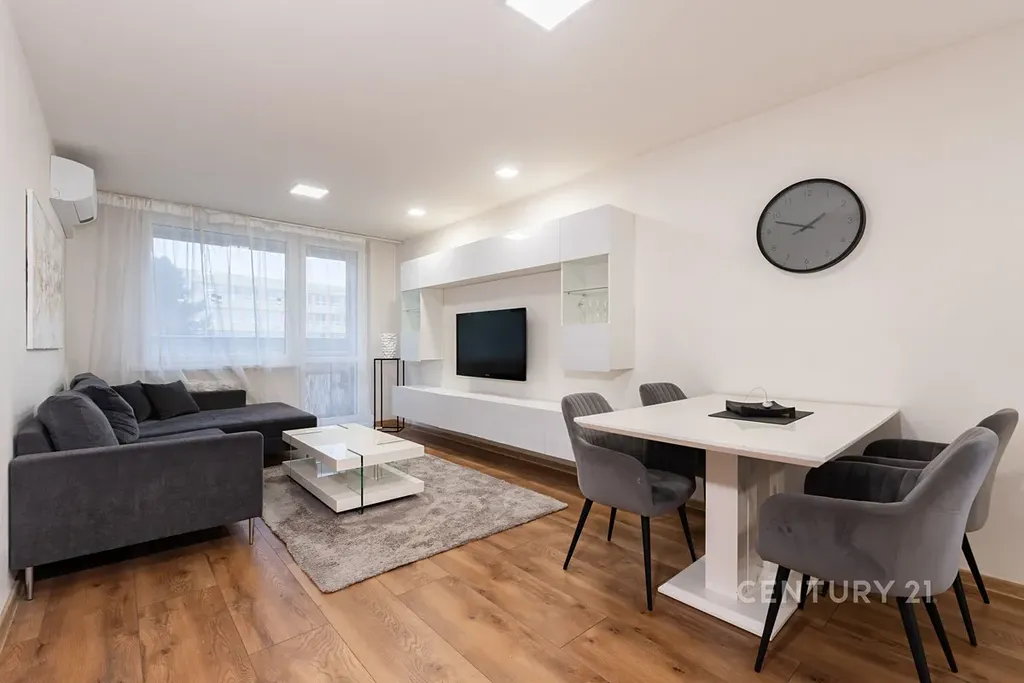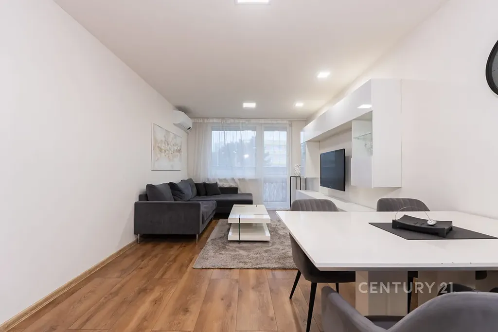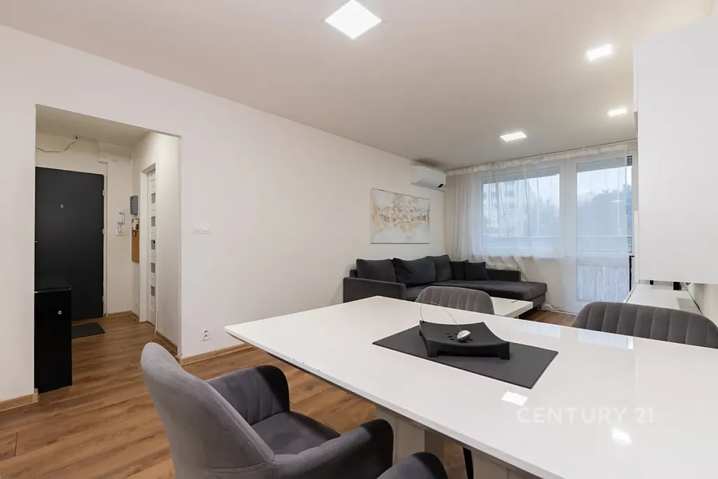 • Obývací a jídelní prostor je sladěn do stejného designu jako kuchyně, je klimatizován a má vstup na zasklenou lodžii. Je zde sedačka, konferenční stolek, TV stěna, koberec a jídelní stůl se židlemi