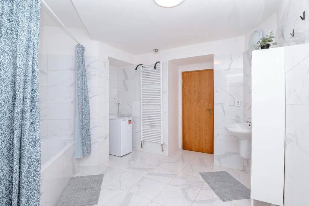 Dispozičně je byt řešený jako 3+kk (118m2), který obsahuje obývací pokoj s jídelnou a kuchyňskou linkou se spotřebiči (lednice, myčka, el. sporák s troubou, mikrovlnná trouba), dvě samostatné ložnice, koupelnu s vanou, umyvadlem, pračkou, samostatná toaleta a předsíň.