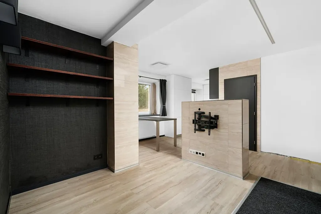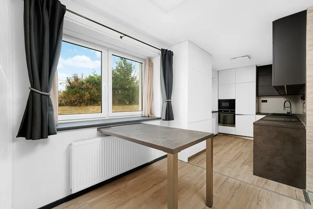 Kuchyně s jídelním koutem (21,8 m2) je orientována na severovýchod. Nová kuchyňská linka s vestavěnými spotřebiči a skříňky až ke stropu nabízí dostatek úložného prostoru. Obývací pokoj (20,1 m2) je průchozí do ložnice (15,9 m2), oba pokoje jsou rovněž orientovány na severovýchod.