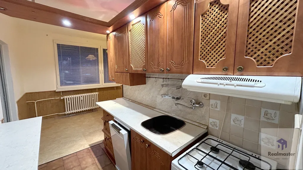 V bytě je kuchyňská linka s plynovým sporákem, kuchyně je do L a je zde místo pro velký jídelní stůl. Koupelna je s hlubokou vanou.