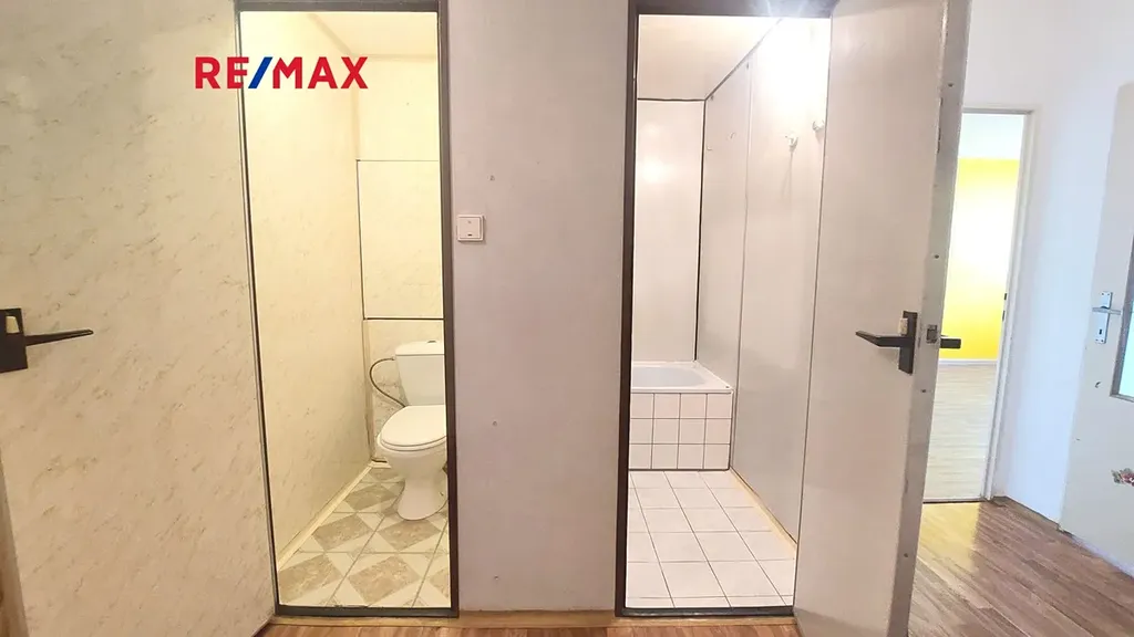 Byt disponuje obývacím pokojem s kuchyňským koutem a ložnicí, koupelnou a samostatným WC. Vybavení bytu je v původním stavu.