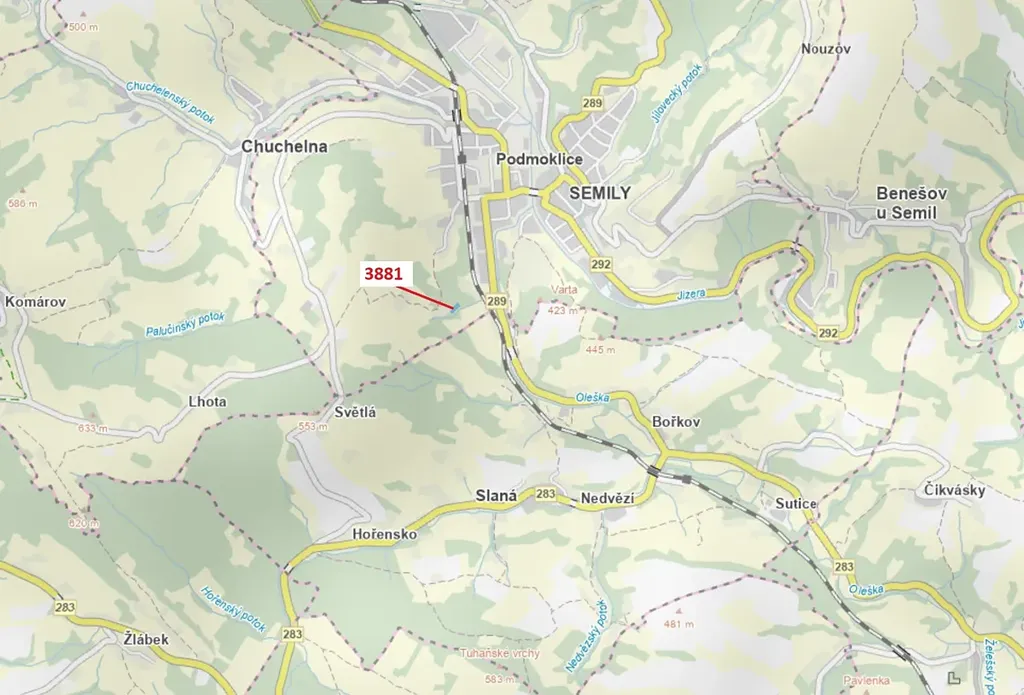 Lesní pozemek o výměře 1939 m2, parcelní číslo 3881, podíl 1/1, katastrální území Semily, obec Semily, obec s rozšířenou působností Semily, okres Semily, Liberecký kraj. Po těžbě.