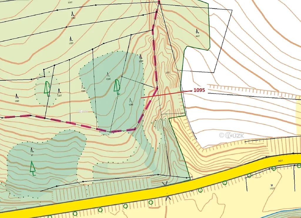 Lesní pozemek o výměře 1427 m2, parcelní číslo 1095, podíl 1/1, katastrální území Mladoňovice na Moravě, obec Mladoňovice, obec s rozšířenou působností Moravské Budějovice, okres Třebíč, Kraj Vysočina.