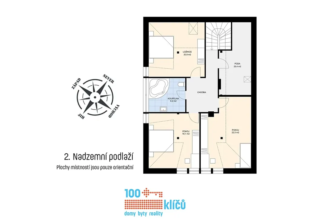 2. Nadzemní podlaží (podkroví): Zde najdete zde tři samostatné pokoje, velkou rodinnou koupelnu s krásným výhledem a praktický skladovací prostor vhodný pro uložení sezónních věcí.
