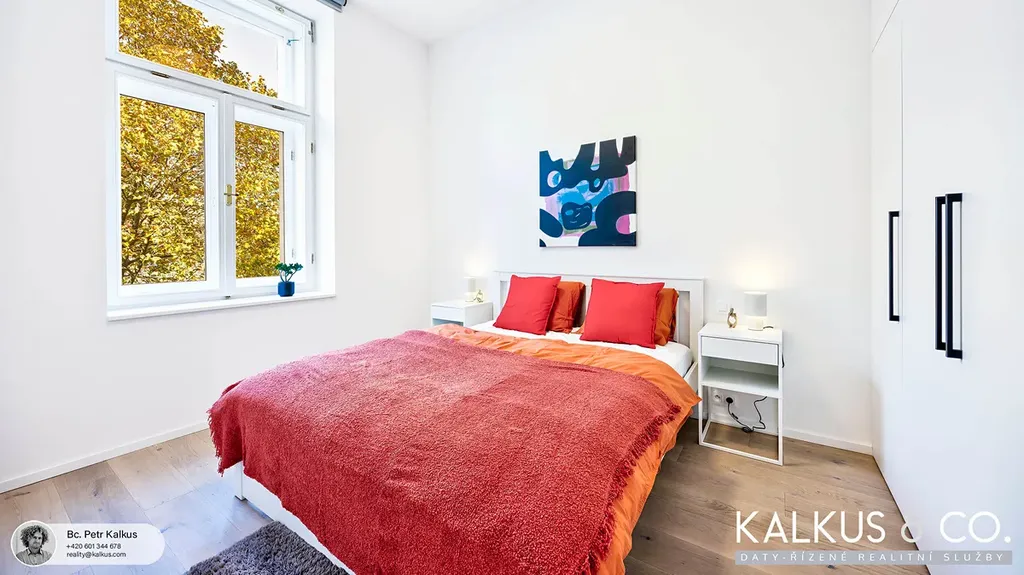 Byt právě prošel citlivou rekonstrukcí v nadstandardním provedení, které spojuje historický šarm s moderním komfortem. Výška stropů 3,2 m, interiérové dveře v plné výšce 210 cm a interiér v jemných světlých tónech dodávají prostoru vzdušnost, eleganci a klid. Každý detail byl promyšlen — od dřevěných podlah a špaletových oken s trojsklem až po vestavěné skříně a kuchyň až do stropu. Podlahové vytápění zajišťuje příjemné teplo, v létě komfort doplní klimatizace a elektricky ovládané stínění.