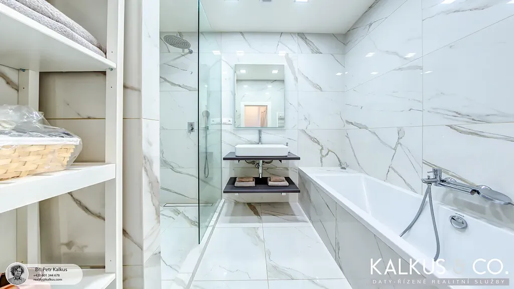 - v koupelně velkoformátová dlažba, vana, "walk-in" sprchový kout