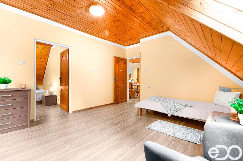 Tato velmi zajímává nemovitost může sloužit jako domov pro rozvětvenou rodinu, či může být užívána částečně i ke krátkodobému pronájmu. Rodinný dům v přízemí nabízí jednotku 3+kk, kde dominuje prostorná obytná místnost v přízemí s krbem, v prvním patře dispozice 6+1 a navíc možnost využití podkroví. Přízemí a první patro má společný pouze vstup, varianta užívání separátně se také hodí. Celou nemovitost si můžete projít v klidu domova prostřednictvím virtuální prohlídky, která je součástí propagace.