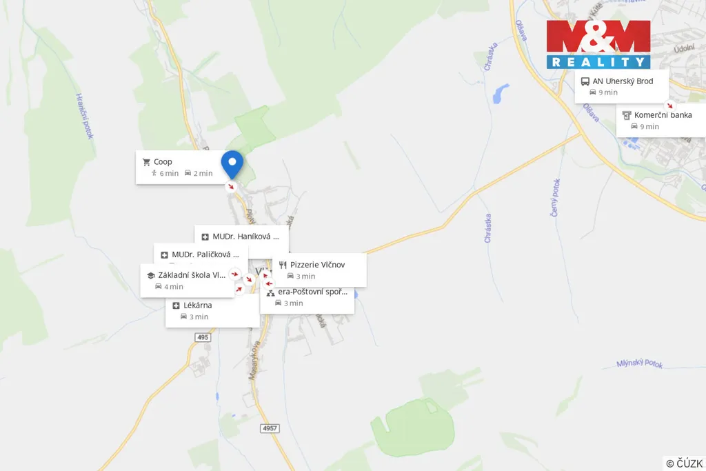 Skvělá dostupnost: Uherský Brod 5 min, Uherské Hradiště 15 min, Luhačovice 20 min, napojení na dálnici 20 min.