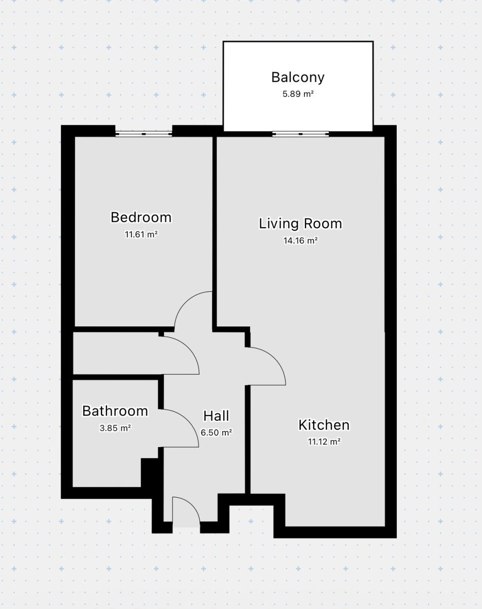 Byt se skládá ze vstupní chodby, koupelny s vanou, toaletou a přípojkou na pračku, samostatné komory, oddělené ložnice a obývacího pokoje společného s kuchyňským koutem. Kuchyně je vybavena sporákem, odtahovou digestoří a myčkou. Z obývacího pokoje je vstup na balkon.