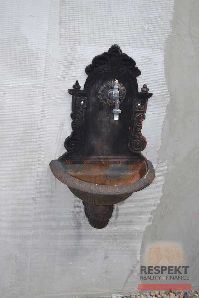 Rovinatá zahrada obdélníkového tvaru s bazénem je ukryta před zraky sousedů cihlovou zdí, porostlou popínavými dřevinami. Na dvoře je k dispozici pergola s udírnou a grilem, dílna a parkovací stání (40m2). Průkaz energetické náročnosti zatím není vyhotoven, musíme uvést "G".