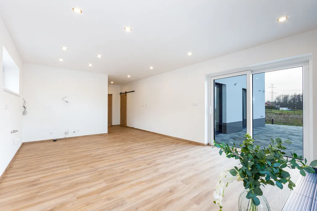 Dispozice domu je promyšlená do posledního detailu. Klidová část nabízí tři samostatné ložnice, které jsou chytře odděleny chodbou od hlavní obytné zóny. Srdcem domu je prostorný obývací pokoj propojený s kuchyní, kde přirozeně vzniká prostor pro rodinný život, setkávání s přáteli i klidné večery u krbu. Nechybí koupelna s vanou i sprchovým koutem, samostatná toaleta ani praktická technická místnost.