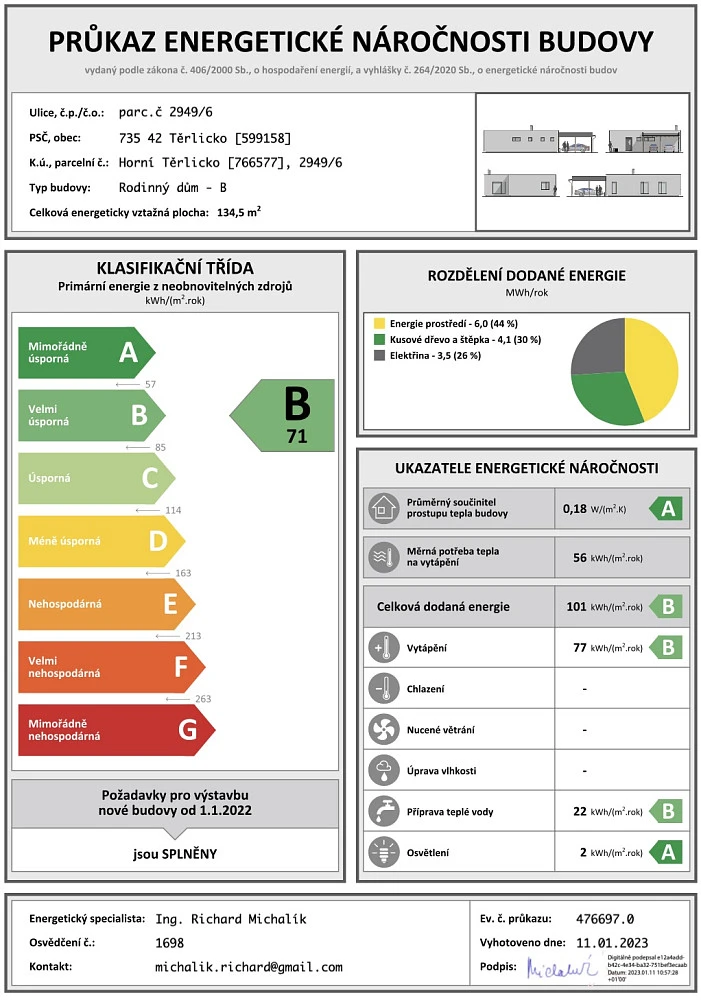 Vytápění je řešeno tepelným čerpadlem s podlahovým vytápěním, které v kombinaci s energetickou třídou B zajišťuje nízké provozní náklady a vysoký uživatelský komfort. Atmosféru domova navíc podtrhují krbová kamna v obývacím pokoji.