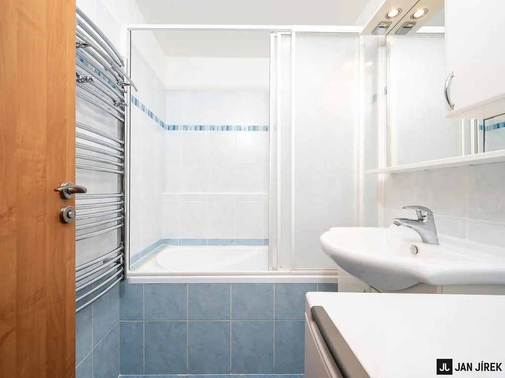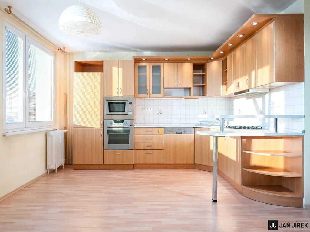 Po levé straně chodby se nachází obývací pokoj s kuchyní na míru, která je vybavena vestavnými spotřebiči (lednice s mrazákem, mikrovlnná trouba, myčka, elektrická trouba, plynová varná deska, digestoř). Po pravé straně chodby najdete dva pokoje, přičemž z jednoho z nich je vstup na prostornou lodžii o ploše 7 m². Na konci chodby se nachází oddělené WC a koupelna se sprchovým koutem. Byt je zabezpečen bezpečnostními dveřmi.