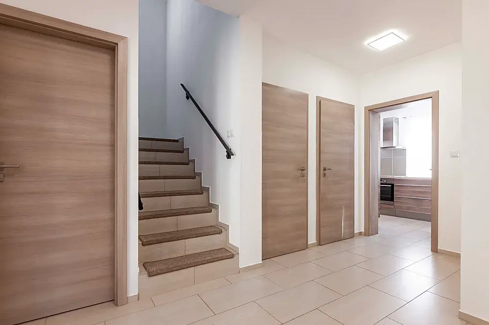 V přízemí domu je nájemci k dispozici vstupní chodba s vestavnou skříní, prostorný obývací pokoj se vstupem na zahradu, plně vybavený kuchyňský kout, jídelna, koupelna se sprchovým koutem, samostatná toaleta, technická místnost. Ve 2.NP jsou pak k dispozici 3 ložnice, koupelna s vanou toaletou a bidetem, šatna.