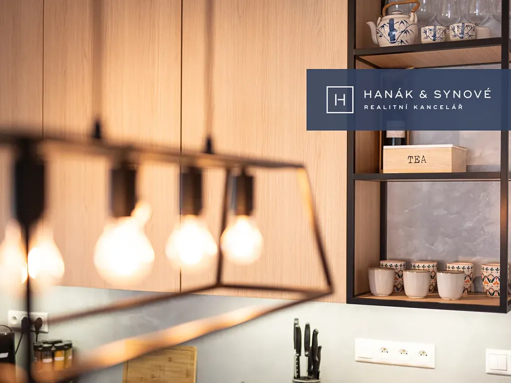 Byt je zařízený ve vysokém standardu a je nabízen částečně zařízený – kuchyňská linka se spotřebiči (indukční varná deska, digestoř, horkovzdušná trouba, myčka, vestavěná lednice s mrazákem, pračka), jídelní stůl se židlemi.