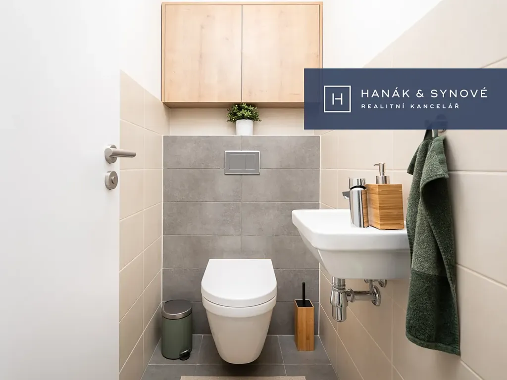 Koupelna je vybavena vanou, umyvadlem se skříňkou a stylovým podsvíceným zrcadlem. K dispozici je také pračka a sušička. Toaleta je samostatná a pro větší komfort disponuje vlastním umyvadlem a úložným prostorem. V předsíni naleznete praktické vestavěné skříně, věšák i botník, které zajišťují dostatek úložného místa.