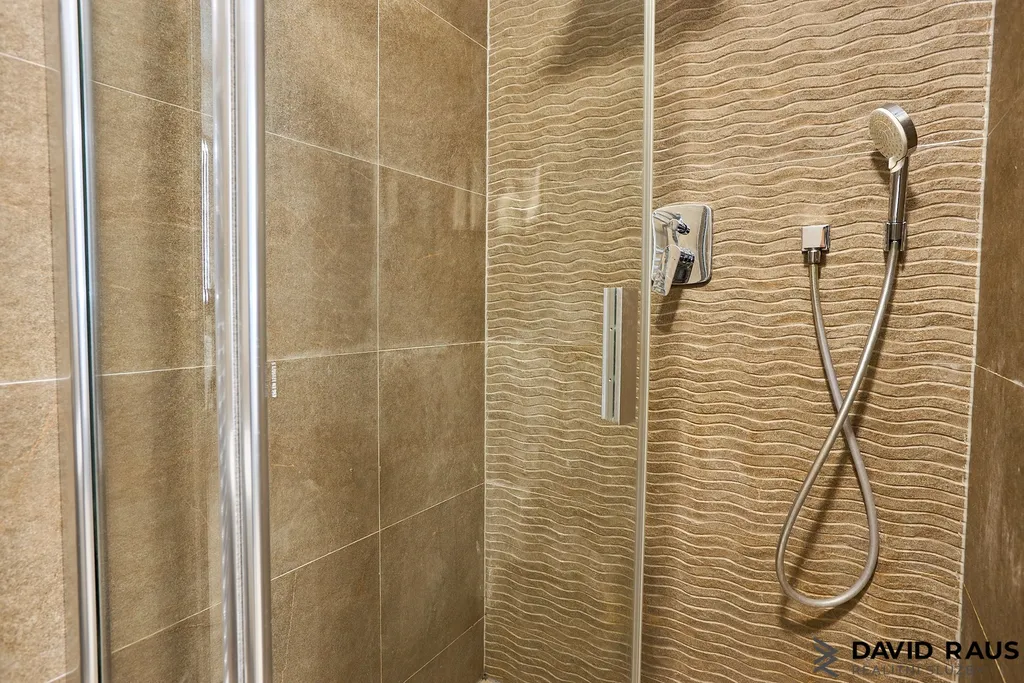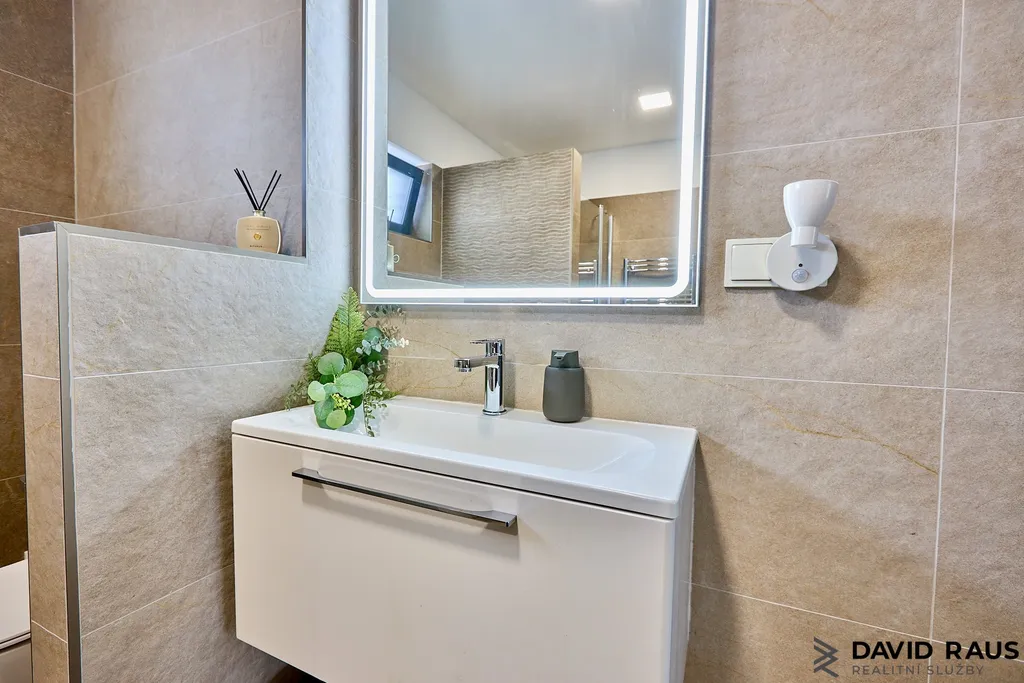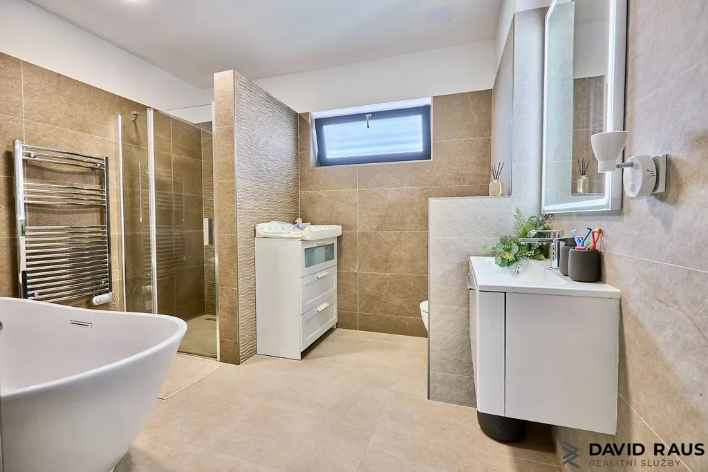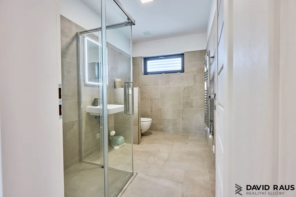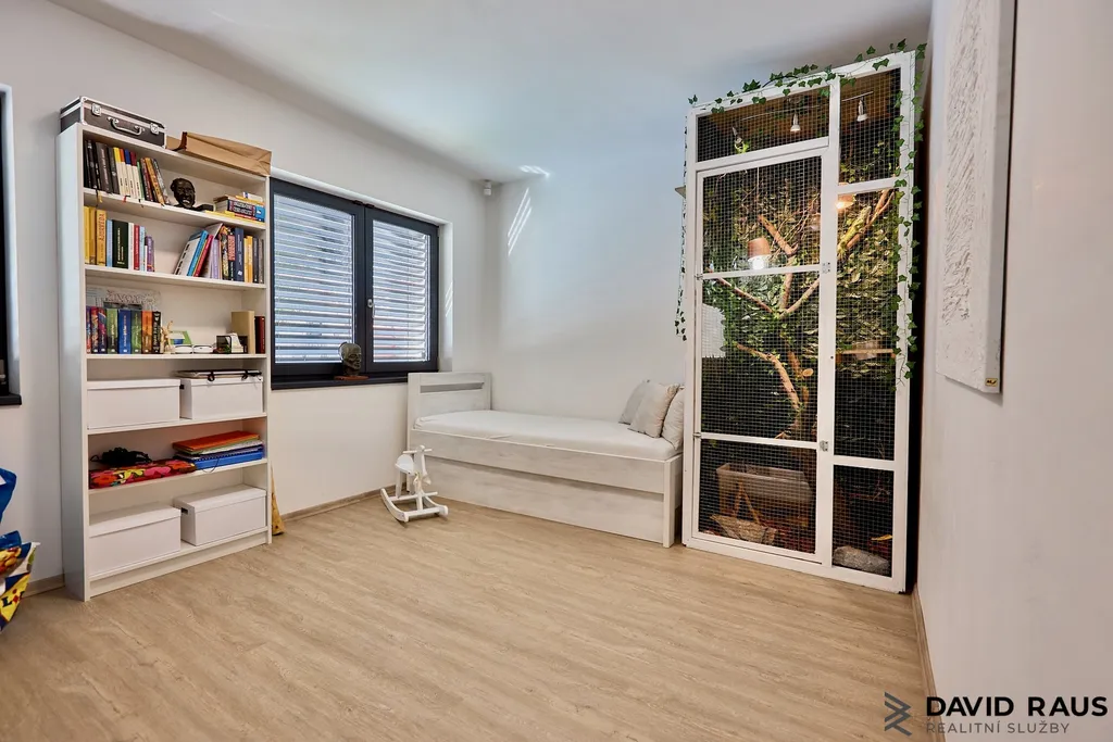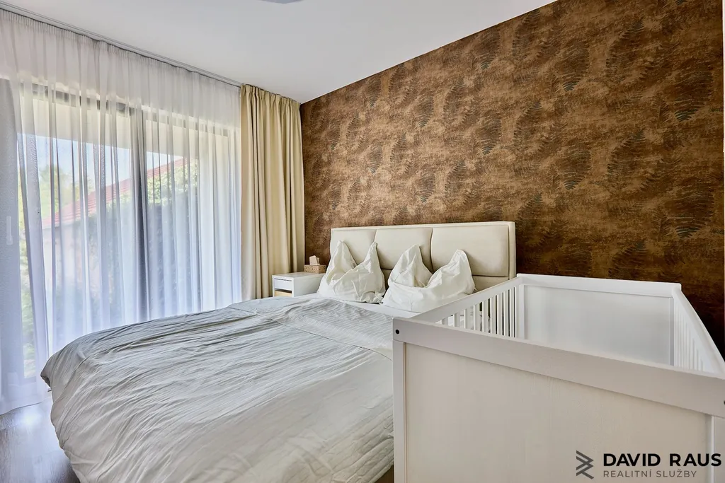 Ložnice i dětský pokoj mají francouzská okna se vstupem přímo na zahradu. Interiér je laděn do přírodních, světlých tónů – vinylové podlahy v béžovo-šedé barvě, bílé stěny, designové koupelny a tapeta s kapradím v ložnici vytváří moderní a útulnou atmosféru.