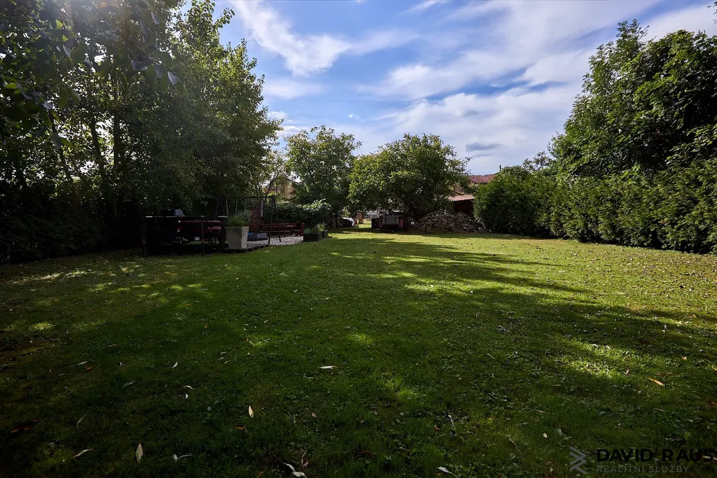 Součástí nemovitosti je prostorná zahrada se vzrostlými stromy a sadem, která nabízí naprosté soukromí i spoustu možností k odpočinku a zábavě. Do sadu se vstupuje kovovou brankou přímo ze zahrady přes dřevěný mostek – už samotný přechod působí kouzelně a navozuje atmosféru klidu. V zadní části zahrady je připravené posezení s grilem, podium pro společenská setkání a hřiště, které poskytuje dostatek místa nejen pro děti, ale i pro sportovní vyžití, třeba fotbal. Dva vzrostlé ořechy zde vytvářejí přirozený stín a mezi nimi je zavěšena houpací síť pro odpočinek. Celkový dojem doplňuje travnatá plocha a útulná zákoutí, kde si každý člen rodiny najde své místo. Tato zahrada se sadem působí jako vlastní oáza klidu – ideální pro rodinný život, zahradní slavnosti i relaxaci v soukromí přírody přímo za domem.