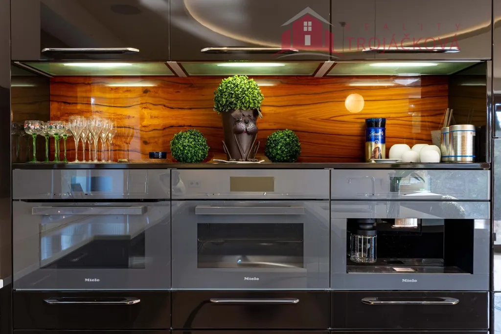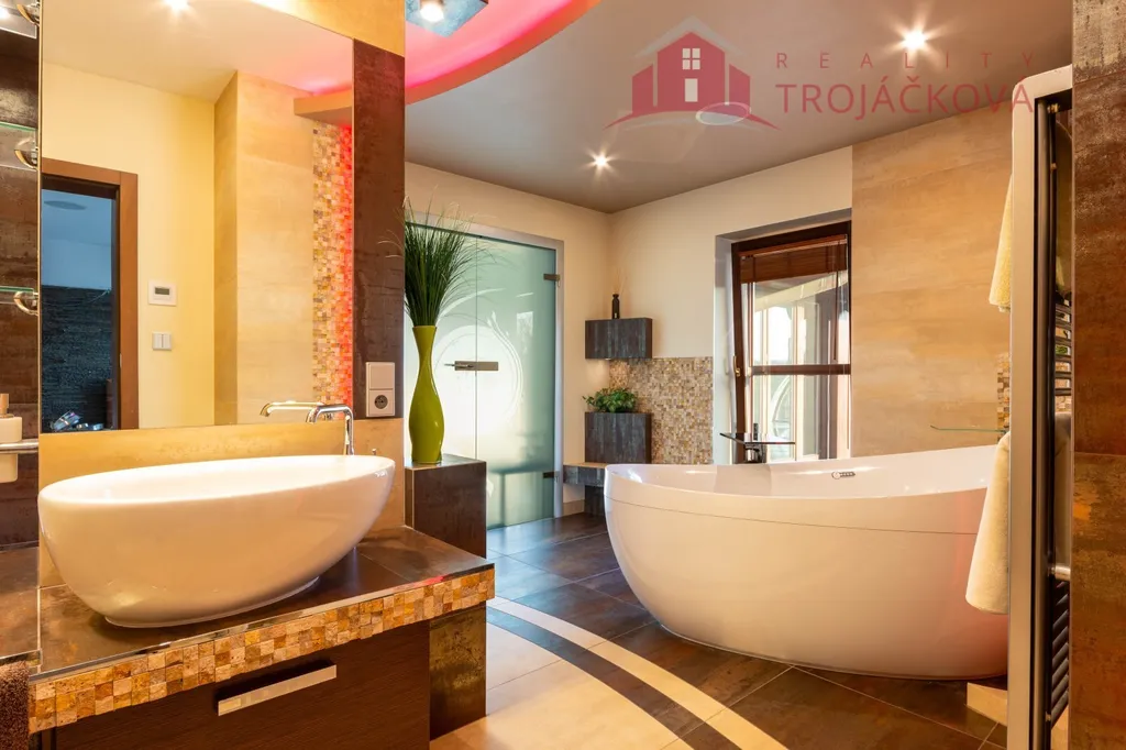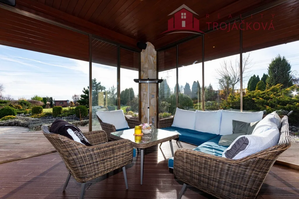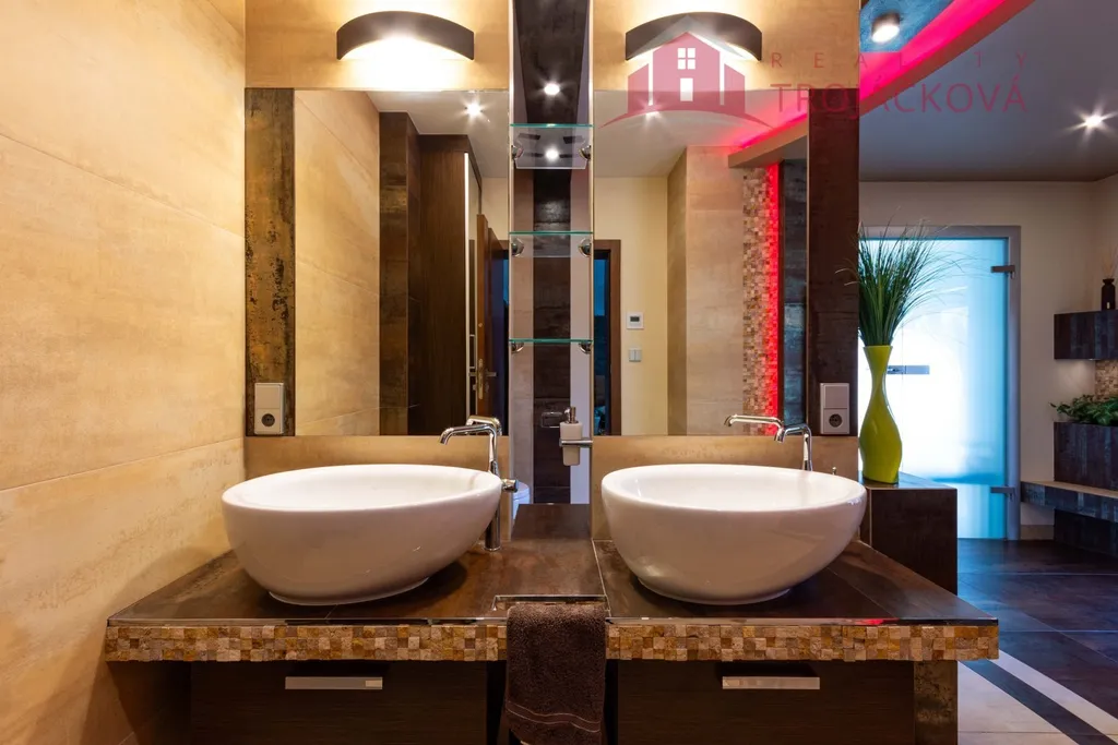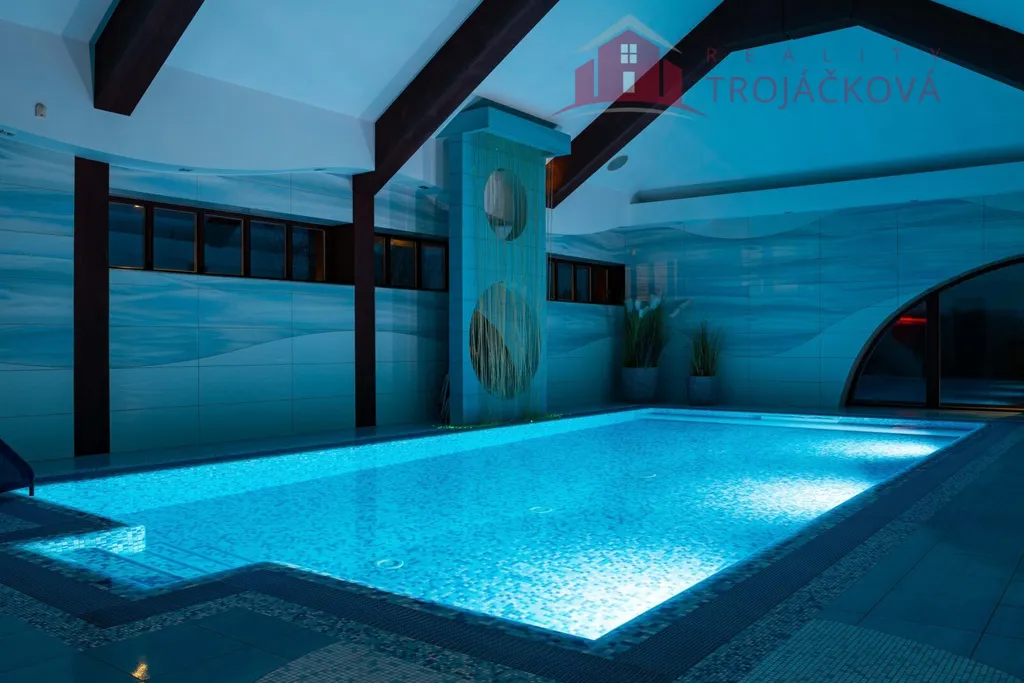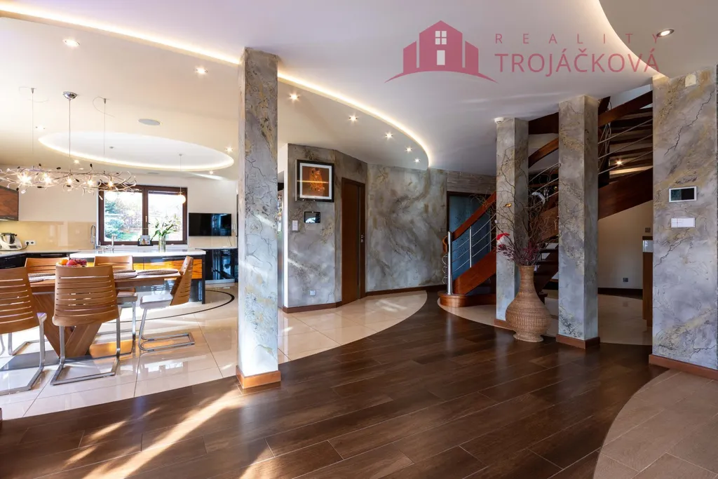 Přízemí se sestává z velkého obývacího pokoje propojeného s otevřenou jídelnou a kuchyní o ploše téměř 97 m2, kde se kombinuje moderní design s praktičností. Z obývací pokoje je vstup do zimní zahrady, je zde je krb a vestavěné mořské akvárium (800 l). Jídelna a obývací pokoj jsou vybaveny stropními designovými svítidly Swarovski. Na obývací pokoj navazuje moderní kuchyně vybavená kvalitními spotřebiči Miele, Liebherr a DeDietrich. Ze zádveří se vstupuje do technické místnosti a do haly a po obloukovém schodišti se z ní vychází do podkroví. Z haly je také vstup do pracovny, WC a ložnice. Na ložnici navazuje koupelna, která je průchozí a je z ní přístup do relaxační části objektu, kde se nachází vyhřívaný bazén s protiproudem (OXY systém) s vodní plochou 4x 8 m, finská sauna - vše s plně automatizovanou bazénovou technologií. Dále navazuje chodba s WC a sprchovým koutem. Z prostoru u bazénu je přímý vstup k vířivce a do zahrady. V podkroví se nacházejí tři pokoje, koupelna a WC. Součástí objektu je garáž se stáním pro 2 osobní automobily. Další dvougaráž je, jako samostatná stavba vedle domu spolu s hosp. budovou.