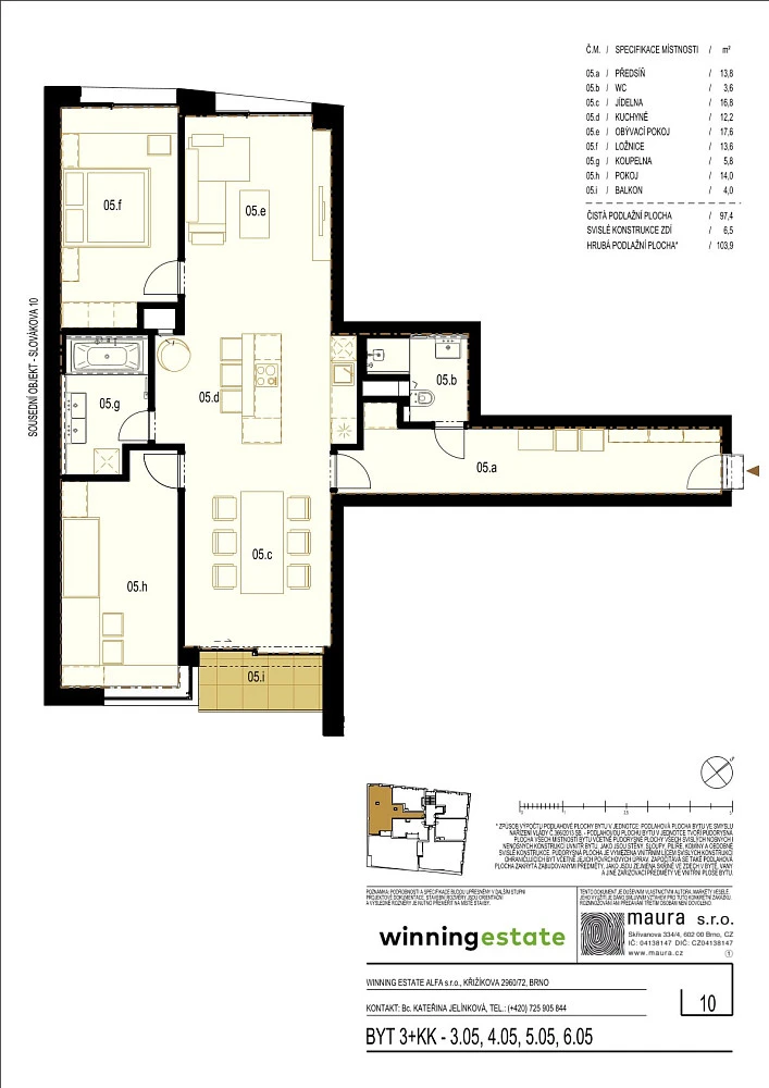 V developerském projektu Slovákova XII nabízíme k prodeji prostorný byt v dispozici 3+kk o výměře 103,9 m² s balkonem 4 m². Byt bude umístěn v třetím nadzemním podlaží. Identický půdorys je ale možné nalézt také na čtvrtém, pátém i šestém podlaží.