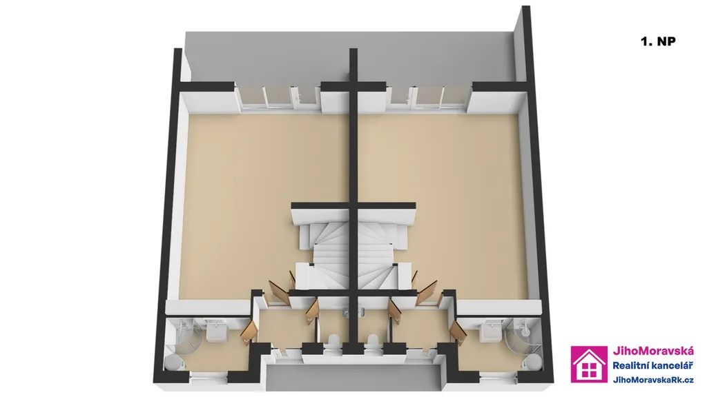 Dispozice domu:1.nadzemní podlaží: předsíň, koupelna (sprchový kout), toaleta, pokoj s kuch. koutem, schodiště a terasa. (oba byty)2.nadzemní podlaží: schodiště, chodba a dva pokoje (oba byty. )Půdorysy obou podlaží naleznete ve fotogalerii.
