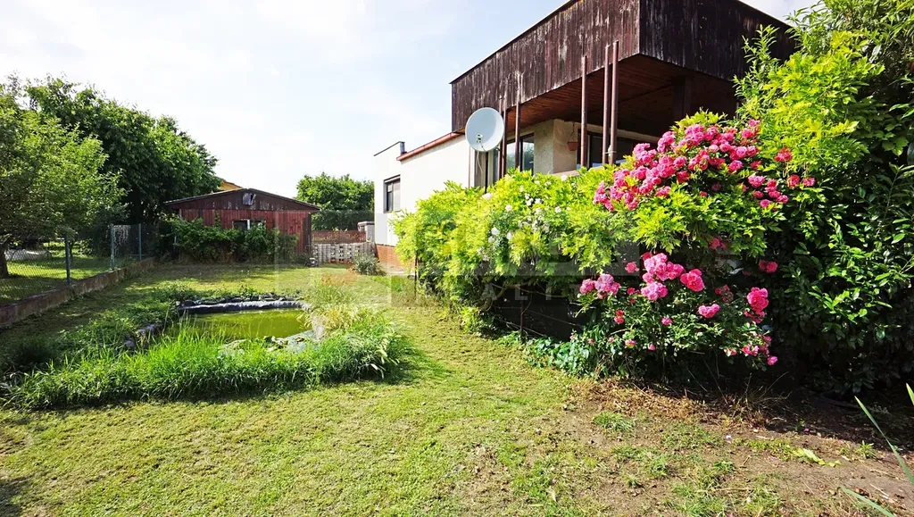 Na zahradě je původní dřevěný zahradní domek zastřešený azbesto-cementovou vlnovkou, který slouží jako sklad zahradního nábytku a nářadí.