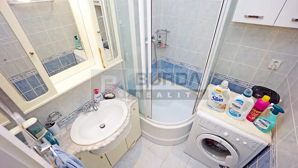 V koupelně je sprchový kout, umyvadlo se skříňkou, skříňka se zrcadlem a přípojky pro pračku.