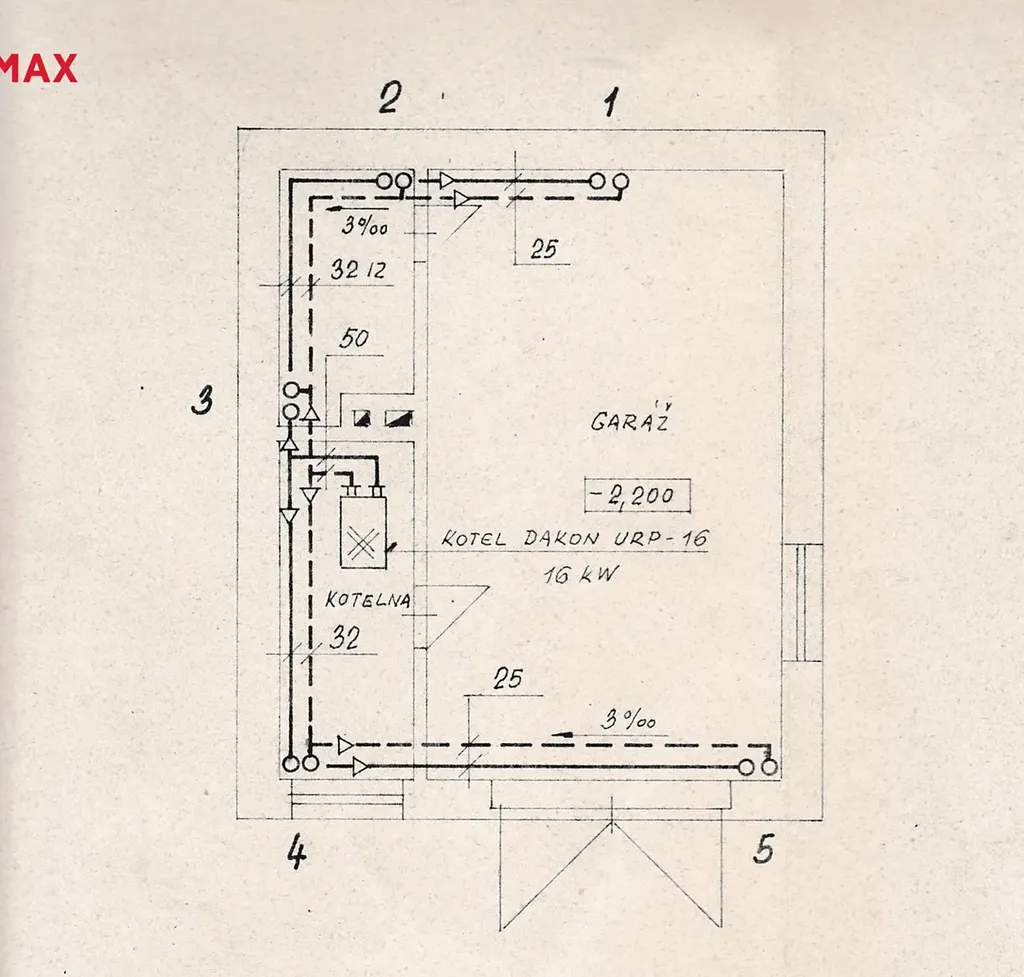 • Částečně zapuštěné přízemí: prostorná garáž a dvě technické místnosti (v garáži domovní vodárna napojená na vlastní kopanou studnu).