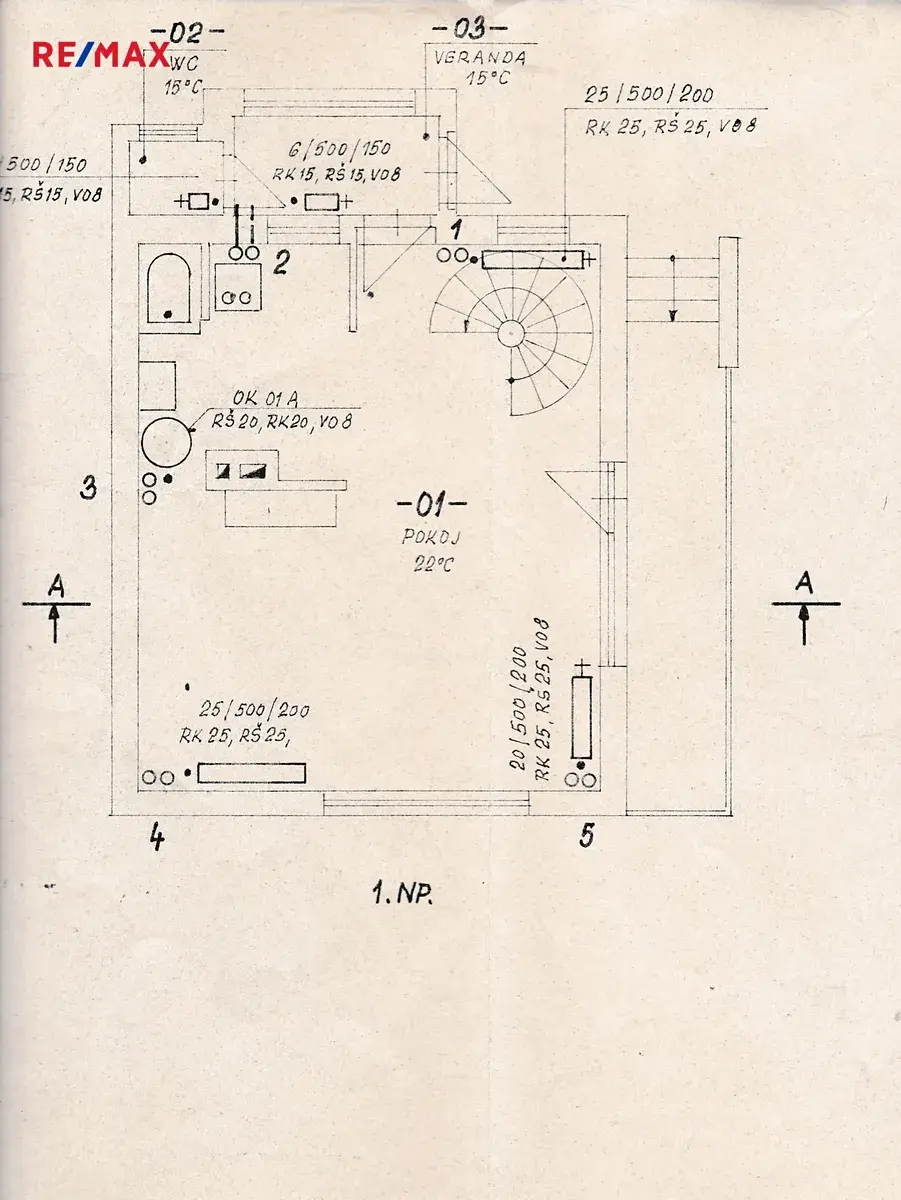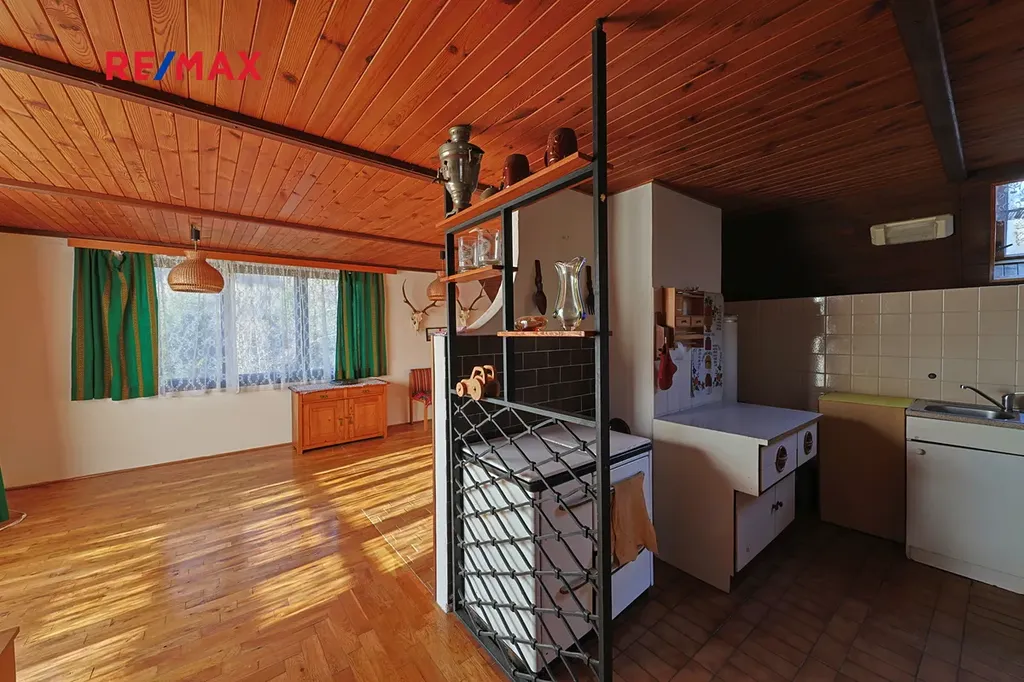 • Nadzemní podlaží: velký obývací pokoj s krbovými kamny a výstupem na jižní terasu, kuchyň, koupelna se sprchovým koutem, WC a vstupní veranda.