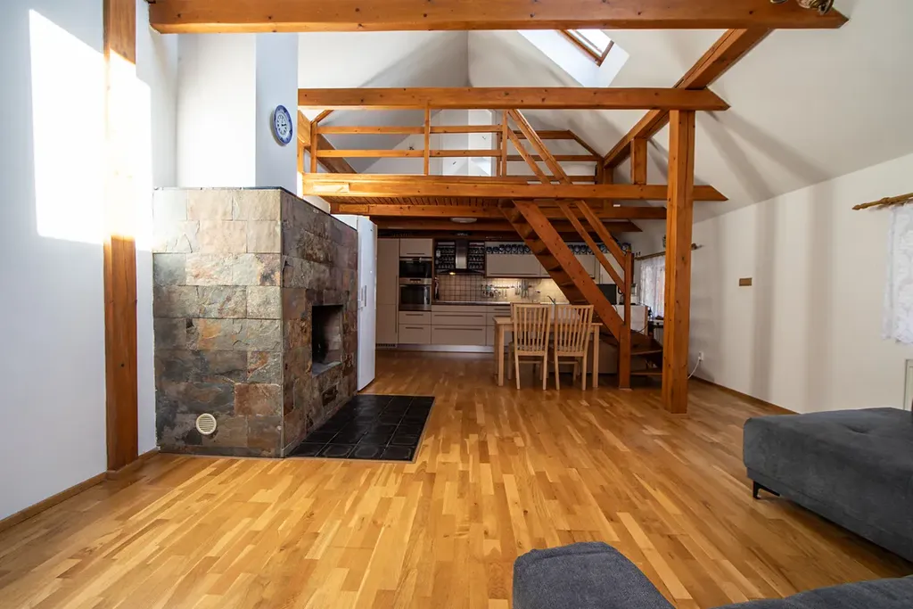 Jednotka č. 1 je byt 4kk o výměře 120 m2 nacházející se v 1. patře domu a sestávající se z předsíňky, schodiště, chodby, obývacího pokoje s kuchyňským koutem a krbem, ložnice, pracovny, koupelny s WC a ložnice v podkrovním prostoru.