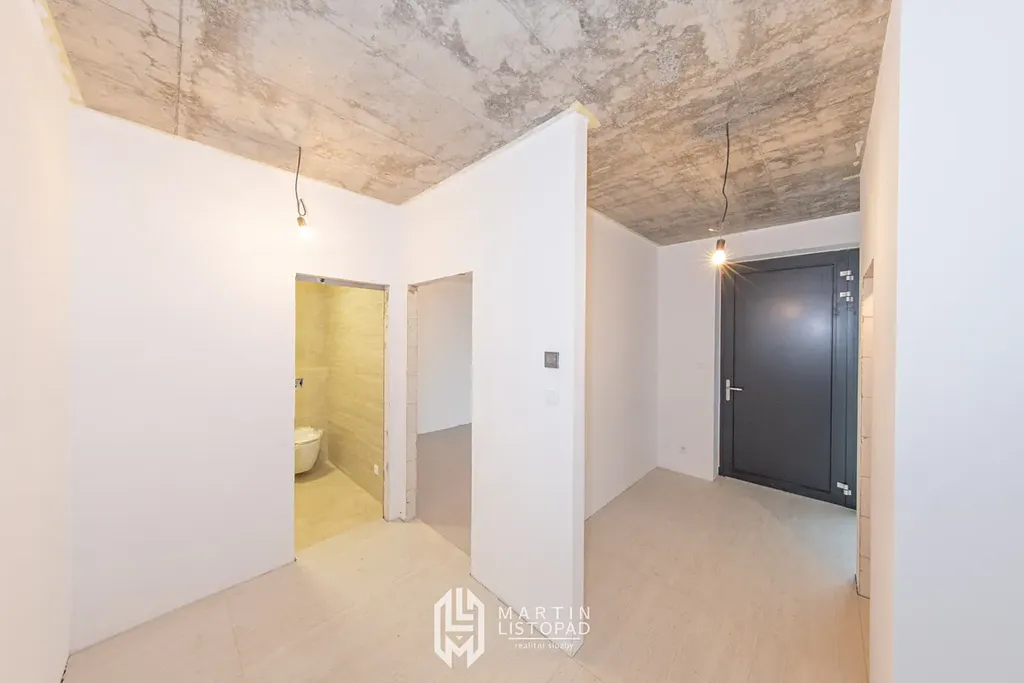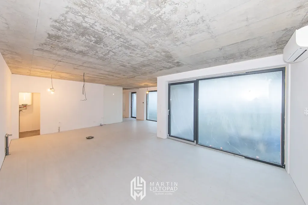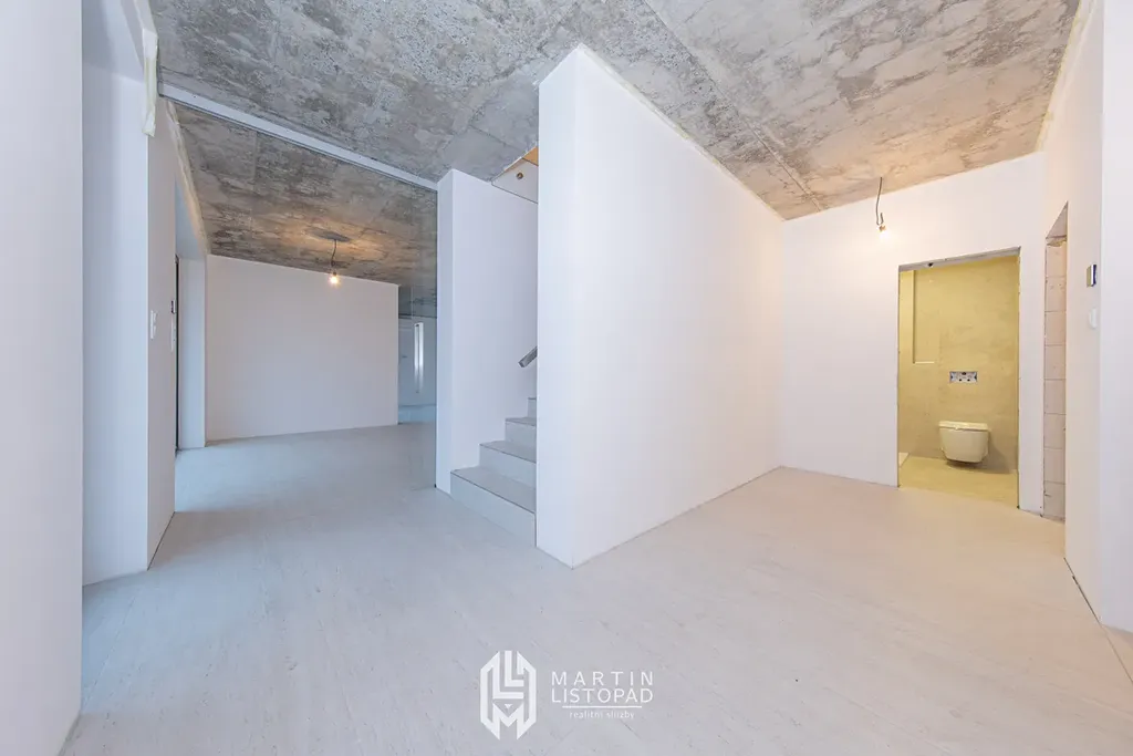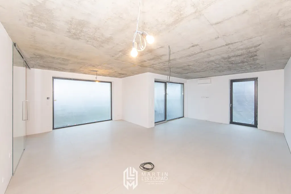 Vizuální dominantou interiéru jsou přiznané betonové stropy, které elegantně kontrastují s designovou velkoformátovou dlažbou. Ta je použita nejen v koupelnách, ale také v obývacím prostoru propojeném s kuchyňským koutem a na chodbách. V některých obytných místnostech je položena kvalitní vinylová podlaha.
