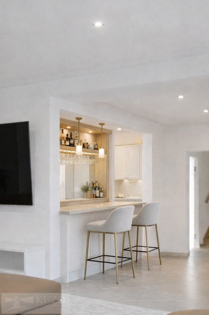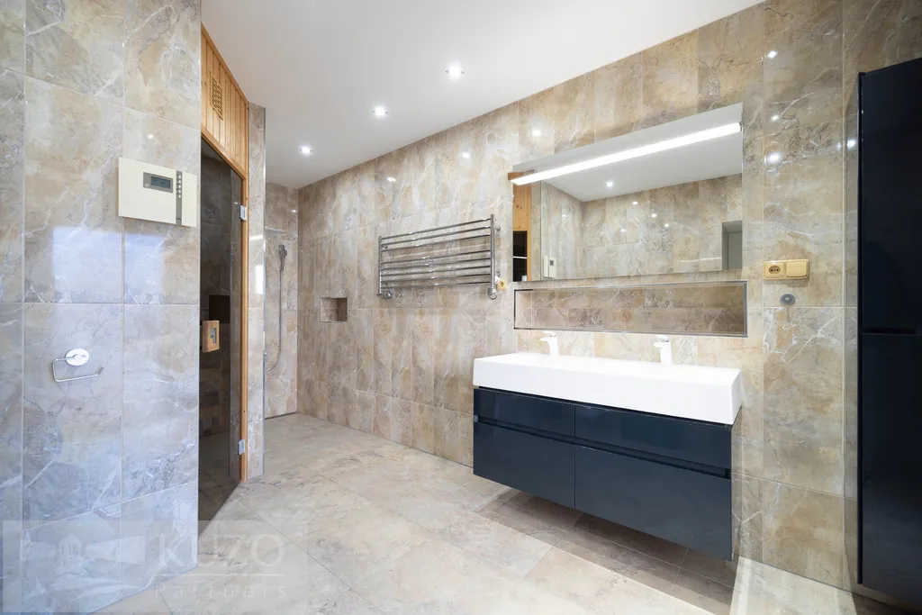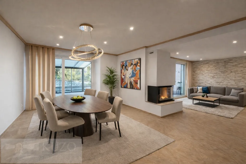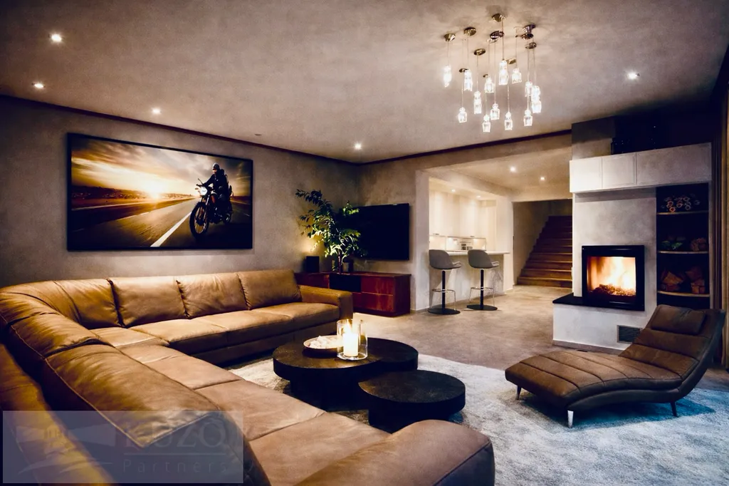 Vytápění zajišťuje elektrický kotel s podlahovým topením, doplněný krbem na dřevo, el. krbovými kamny.