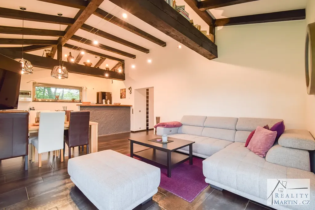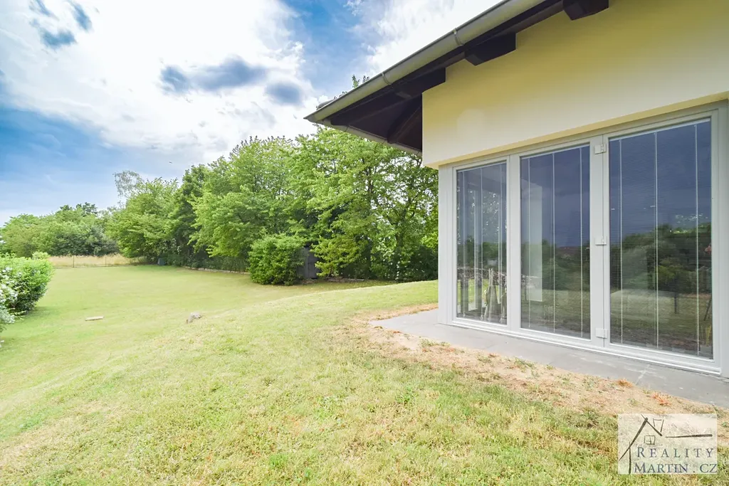 V obývacím pokoji velká francouzská panoramatická okna s možností kompletního otevření oken zajišťující systém posuvných kolejnic. Díky těmto oknům je zajištěn nádherný výhled na zahradu, okolní lesy a pole.