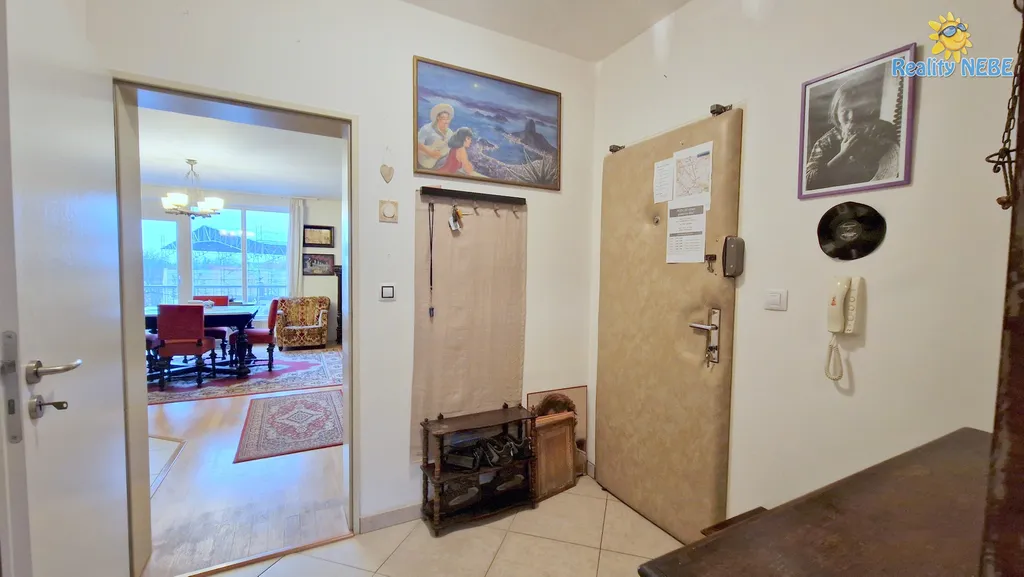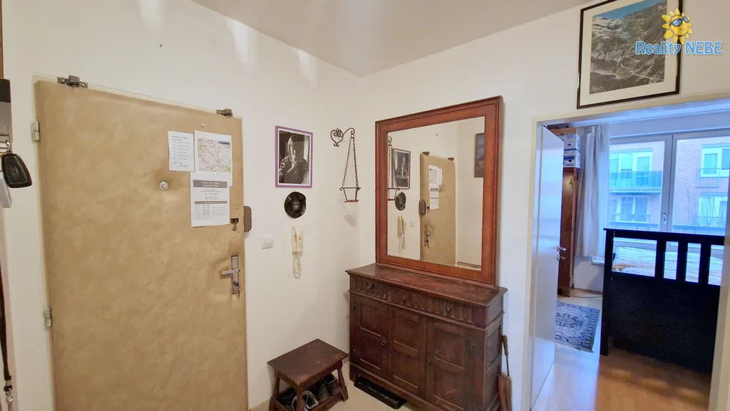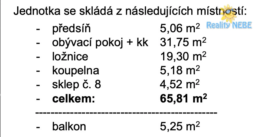 Byt se nachází v prvním patře s pěkným výhledem na Uhříněveský kostel. Skládá se z prostorného obývacího pokoje s kuchyňským koutem (32 m2), ložnice (19 m2), předsíně (5 m2), koupelny (5 m2), balkonu (5 m2) a sklepu (5 m2). Kuchyňská linka je s vestavěnými spotřebiči, elektrickou troubou, mikrovlnnou troubou a myčkou na nádobí. Ložnice je orientovaná na východ, obývací pokoj s balkonem na západ. V obou místnostech je velké třídílné francouzské okno.